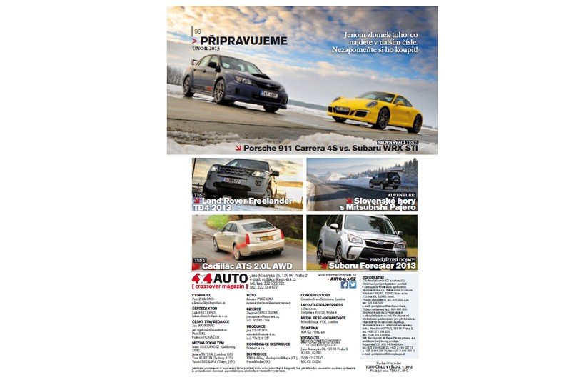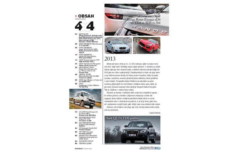 První vydání 4×4 Automagazínu pro rok 2013 již najdete na pultech ve svých oblíbených trafikách, čerpacích stanicích nebo přímo ve vašich schránkách. Tak jako vždy jsme pro připravili celou řadu testů, nechybí pravidelný srovnávací test, test amerického automobilu a zapomenout nemůžeme ani na oblíbenou rubriku bazarových testů, kde se vám tentokrát představí Mitsubishi Outlander. A jako novoroční bonus přidáme speciální přílohu – kalendář pro rok 2013 s novým Range Roverem.