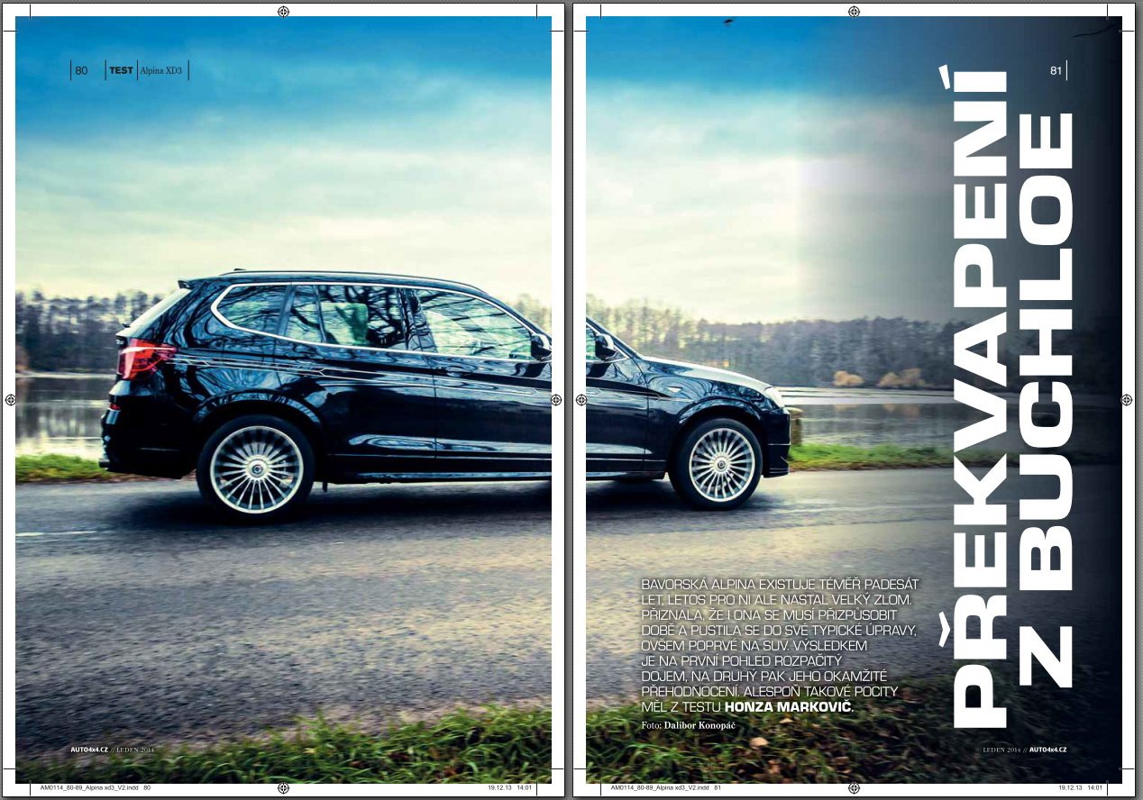 <p>Kdyby vám ale BMW bylo málo, co takhle sáhnout po Alpině? Jednu takovou jsme zkusili, konkrétně model XD3, první SUV od této malé manufaktury z Buchloe. A hned překonalo rekordy. Stejně tak nás dostalo Audi RS6 Avant nebo brutálně rychlé Porsche Panamera Turbo. Zkrátka lednové číslo bude pro automobilové nadšence pořádný zážitek. Pokud mezi ně patříte, navštivte svého oblíbeného stánkaře. Lednové vydání 4×4 AM se na vás těší.</p>