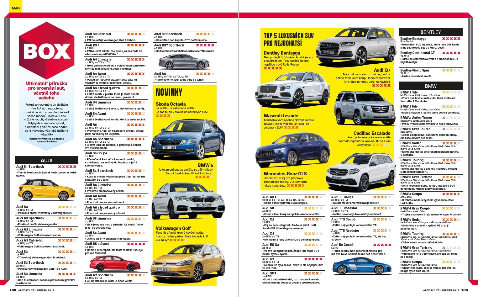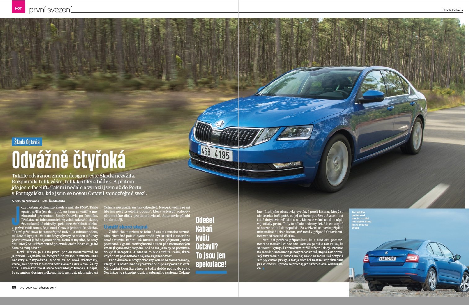 Nový 4×4 Automagazín je na stáncích. V březnovém čísle se Honza Markovič vydal za Range Roverem Velar, kterého mohl jako jeden z mála obdivovat v plné kráse. A věřte nám, je na co se dívat. Kromě toho se Honza hluboce podíval do čtveřice očí faceliftované Octavie nebo okusil Porsche 911 GTS na okruhu. A rovnou v Kapském městě. Petr Šikl vyrazil omlazených Mitsubishi ASX do Rakouska, aby se vrátil rovněž modernizovaným Outlanderem a poznal výhody faceliftovaných modelů. Kromě toho jsme pro Vás otestovali celou řadu zajímavých modeů (VW Amarok, Toyota C-HR, Peugeot 3008 GT nebo Seat Ateca). Kromě toho se v bazarové rubrice dozvíte, zda je dobrý nápad koupě ojeté Suzuki SX4 s pohonem všech kol.
