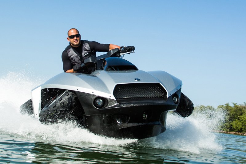 Díky tomu zvládne uhánět rychlostí přes 70 km/h. A to jak v terénu, tak na vodě. Stačí s vozítkem jednoduše najet do vody a stisknutím patřičného tlačítka se jeho kola zvednou a můžete pokračovat. Nádrž s objemem 57 litrů zaručí solidní dojezd.