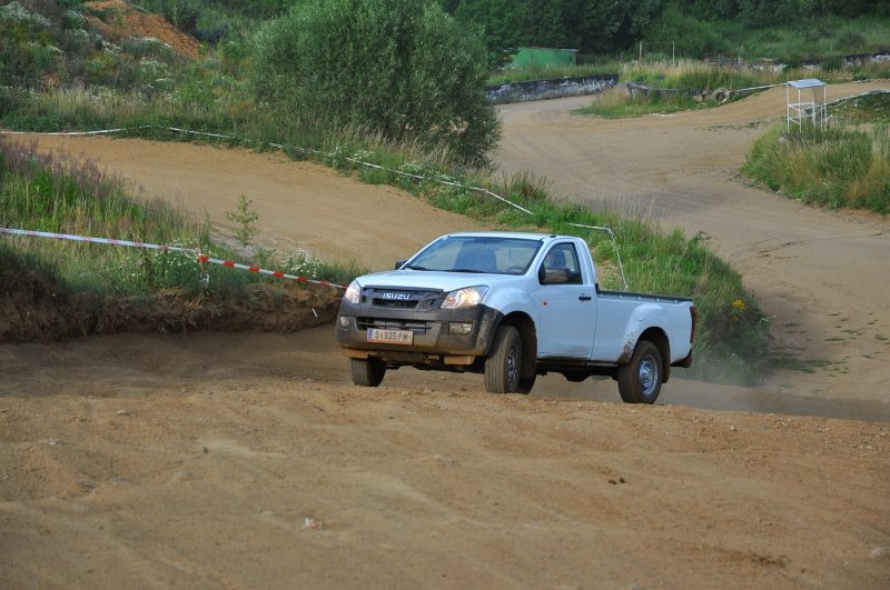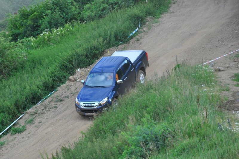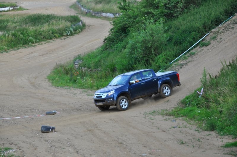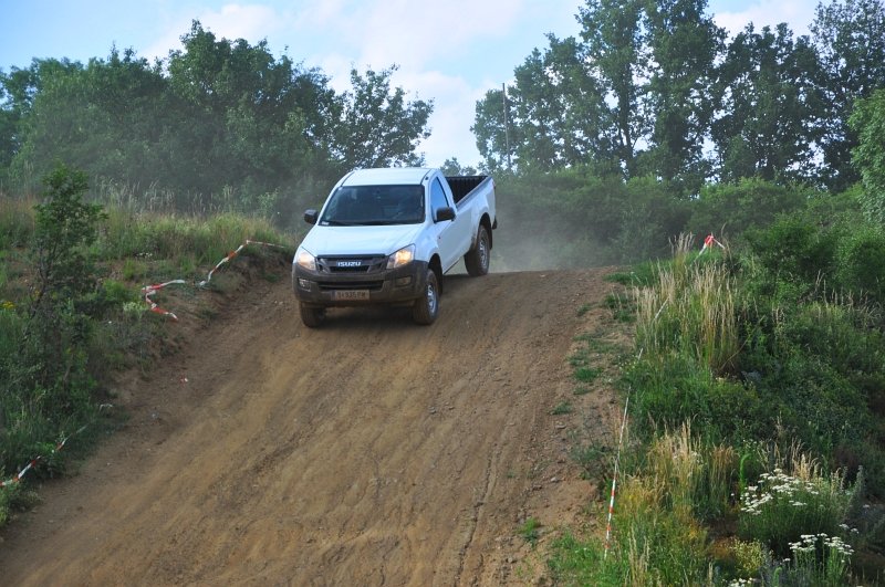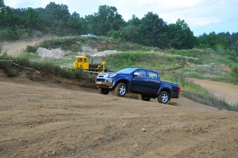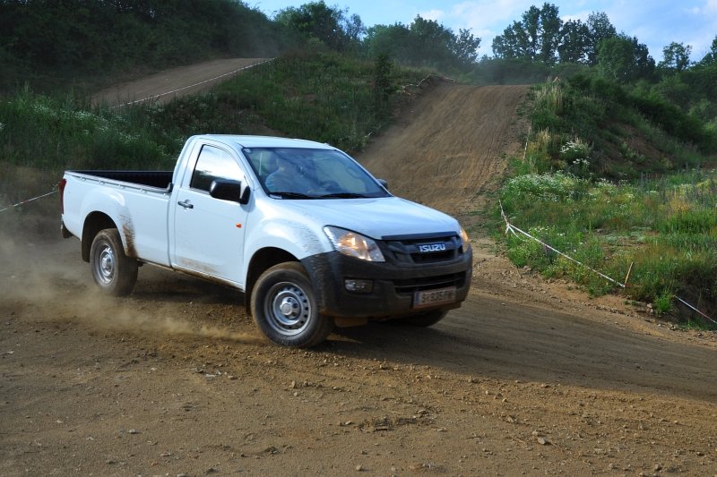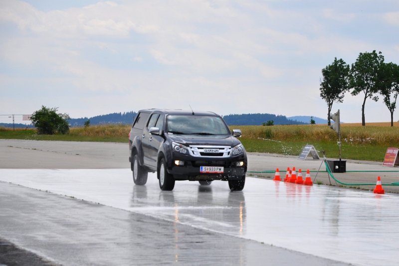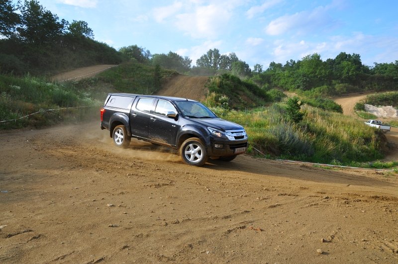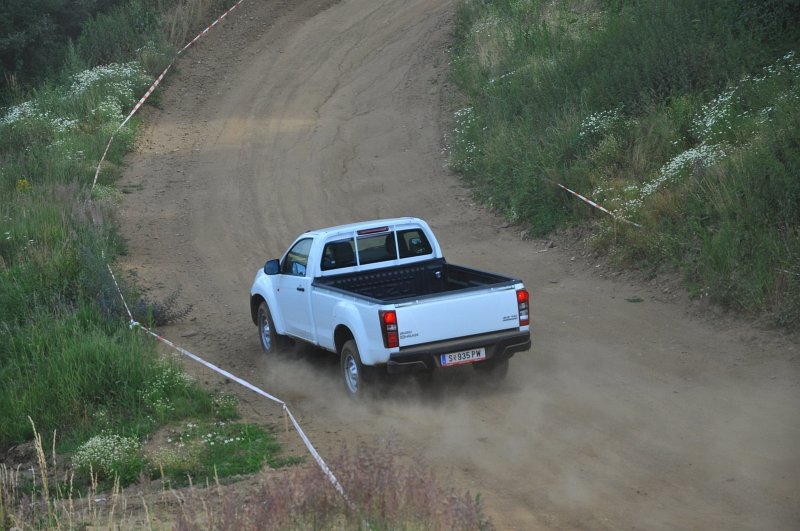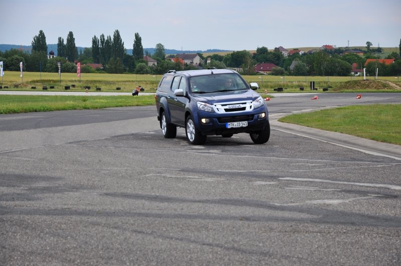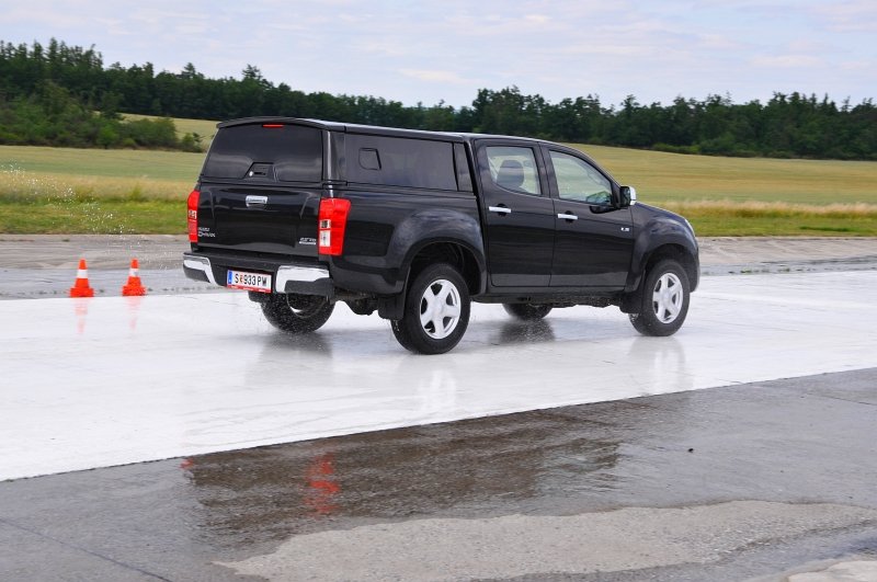 Vodou skrápěné kluzné plochy na polygonu umožnily vyzkoušet nouzové brzdění a chování v zatáčkách, nechyběl ani slalom mezi kužely nebo losí test. D-Max má plně vypínatelný stabilizační systém – kratší stisknutí jej omezí, delší zcela odpojí. Na hladkém mokrém povrchu tak bylo možné si ověřit, že se zapnutým pohonem zadních kol lze pick-up snadno navést do přetáčivého smyku, který stačí korigovat plynem. Terénní vložka spočívala v průjezdech vymezenou tratí na motokrosovém polygonu, na brodění či křížení náprav tedy nedošlo, nicméně s prudkým stoupáním a rozbahněnými partiemi si poradil bez nutnosti použít redukci. Ta přišla ke slovu až při sjezdu, kdy motor na zkrácenou jedničku auto bez obtíží ubrzdil.
