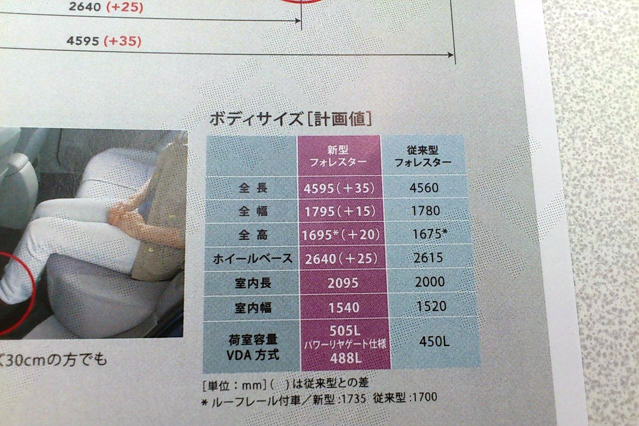 Nový Forester naroste do délky na 4595 mm (+ 35 mm), do šířky na 1795 mm (+ 20 mm) a do výšky na 1695 mm (+ 15 mm). Také prostoru pro pasažéry a zavazadla lehce přibyde: s rozvorem prodlouženým na 2640 mm (+ 25 mm) se zvětšil i kufr. Japonský katalog udává dvě hodnoty podle metodiky VDA: 505 l a 488 l, naše japonština bohužel není na takové úrovni, abychom upřesnili, k čemu se vztahují. Nejspíše však půjde o obvyklou kombinaci minirezerva/plnohodnotná rezerva či sada na lepení. Dodejme, že stávající Forester má 450 l.