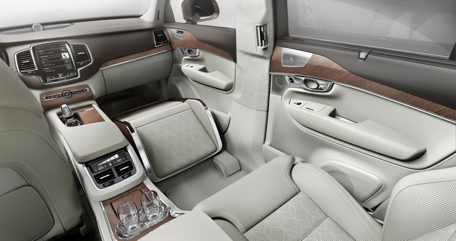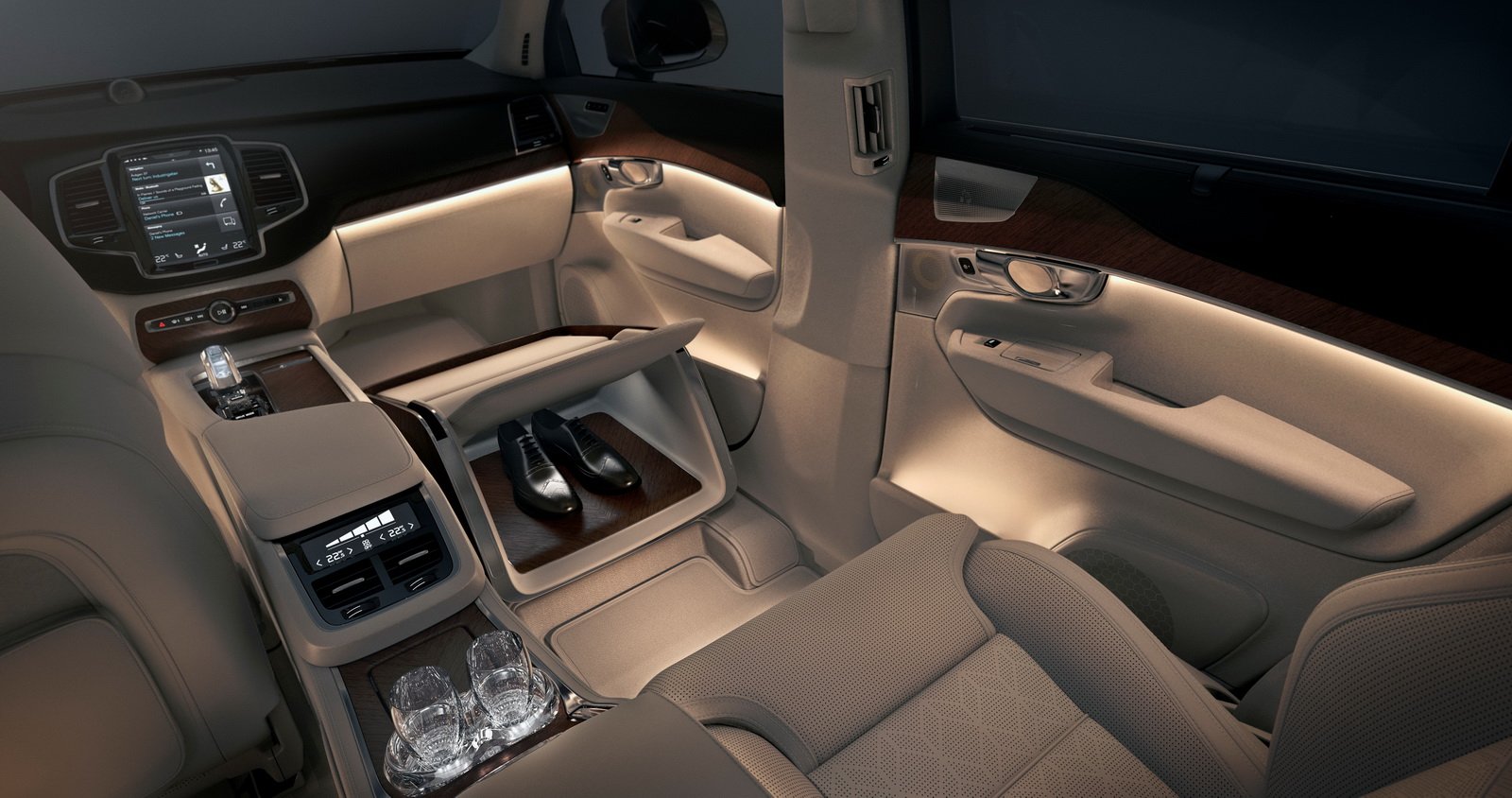 Nové Volvo XC90 je velmi luxusní už ve svých největších výbavách, ale ve Švédsku připravili ještě luxusnější varianty. Jedna je čtyřmístná a nabízí takové ty obvyklé věci jako lednici, křišťálové skleničky, masáže, ta druhá se jmenuje Lounge Concept a je dokonce jenom třímístná.