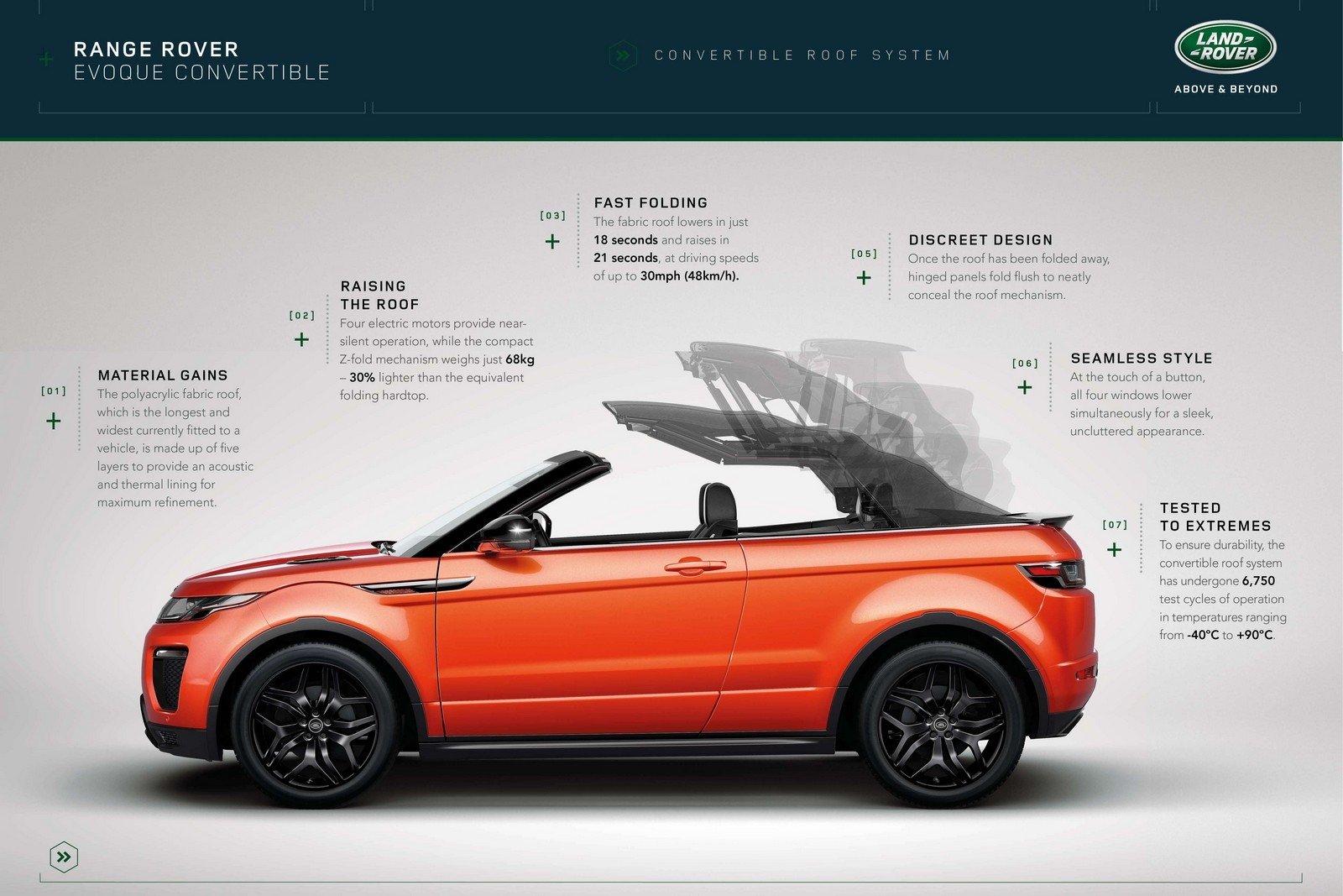 Jak se dalo dopředu očekávat, novinka se prakticky vůbec neliší od dříve představeného konceptu. Případné odlišnosti má na svědomí pouze relativně nedávný facelift Evoque jako takového. Vůz dostal plátěnou stahovací střechu, se kterou můžete manipulovat do rychlosti 48 km/h. Složená je za osmnáct sekund, k natažení potřebuje o tři sekundy více. Land Rover si údajně dal na konstrukci velmi záležet, střecha byla testována při teplotách o +90 °C do -40 °C. Interiér je čtyřmístný, ve druhé řadě se samozřejmě s prostorem muselo šetřit. Do kufru naložíte maximálně 251 litrů nákladu.