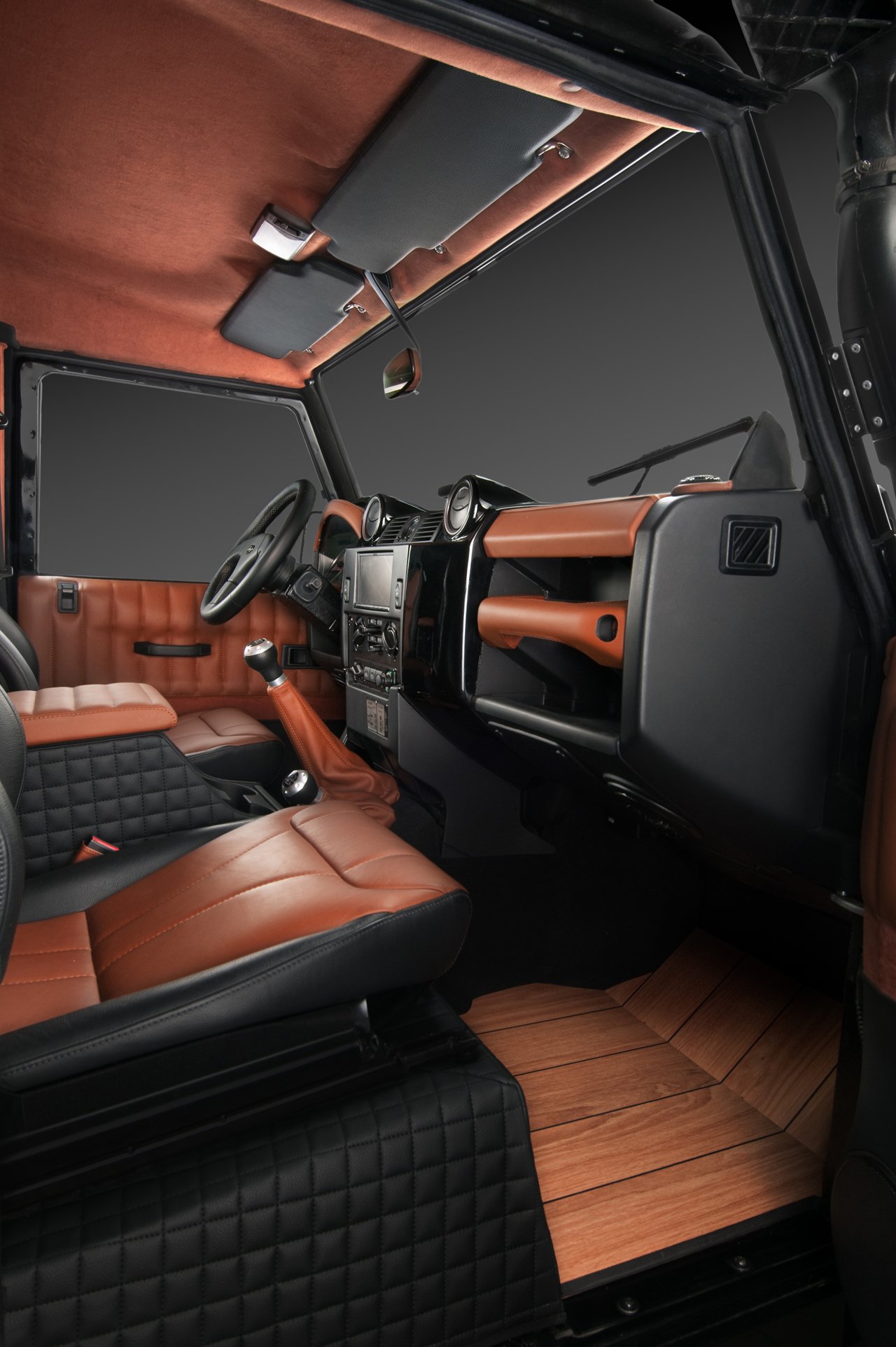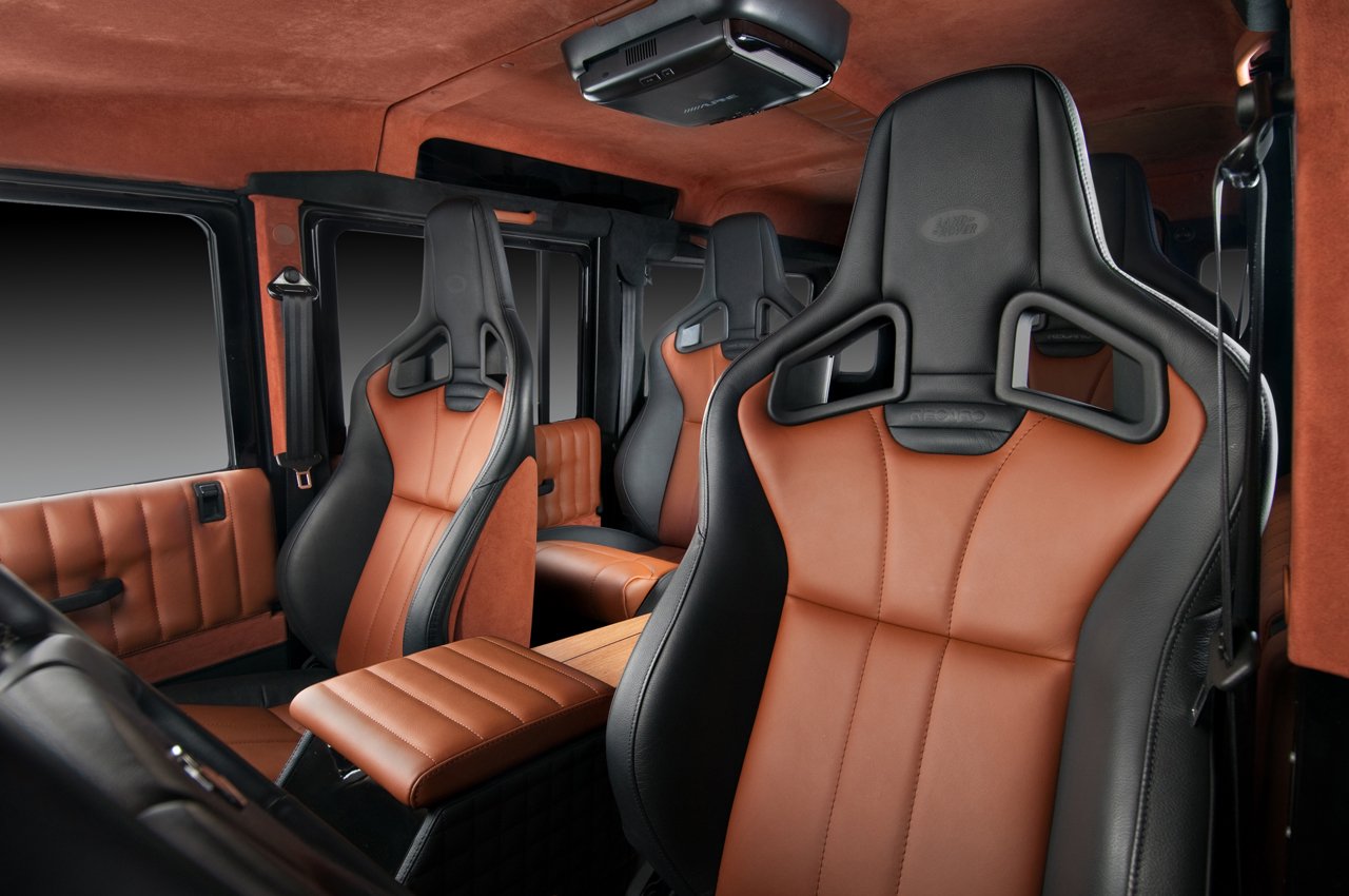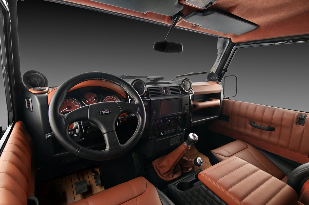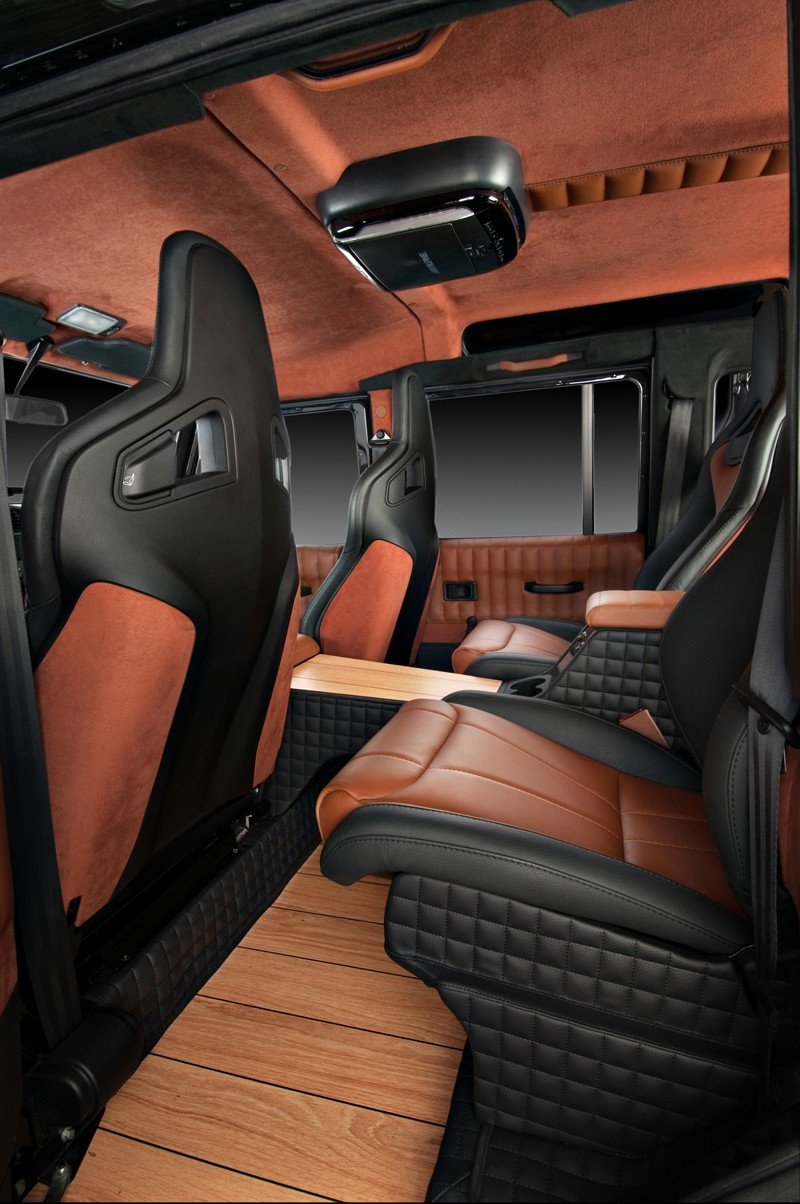 V interiéru Land Roveru Defender Wood tedy najdeme: sportovní sedačky (vzhledem k zaměření vozu asi trochu nadbytečné), čalounění v hnědo-černé kombinaci kůže Napa, kožené potahy loketní opěrky, alcantarou obšité prakticky vše, co obšít šlo (i třetí brzdové světlo a vnitřní zpětné zrcátko), podlahu obkládanou dřevem a v zavazadlovém prostoru, který tím trochu ztratil svoji funkci, audiosystém Ground Zero o výkonu 600 W. Ten je nejspíše důvodem, proč je celá kabina důkladně odhlučněná. Pasažéři si navíc můžou užívat videa z DVD přehrávače na patnáctipalcové obrazovce. O ceně tisková zpráva nehovoří a je to tak možná lepší.
