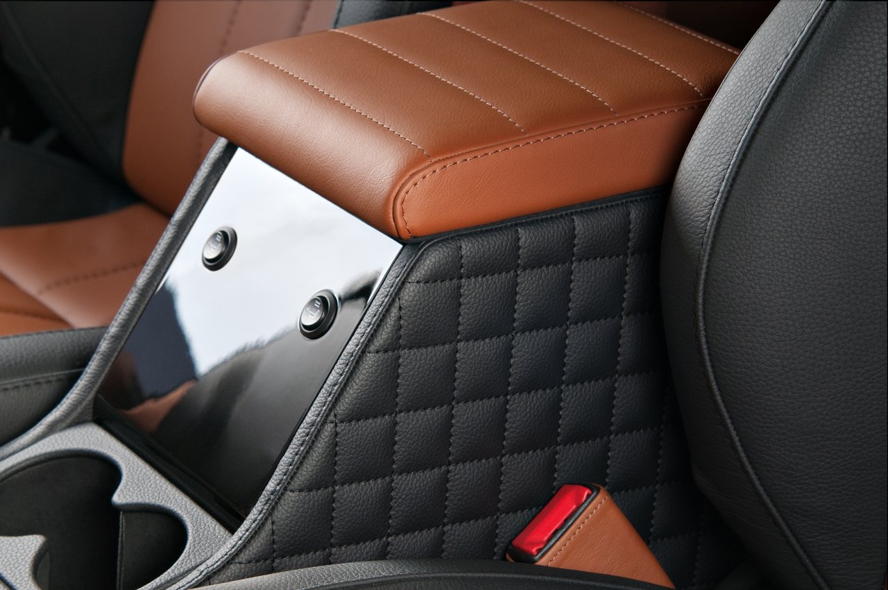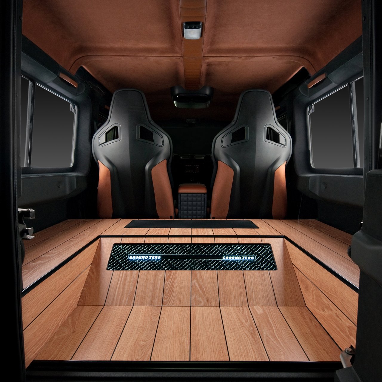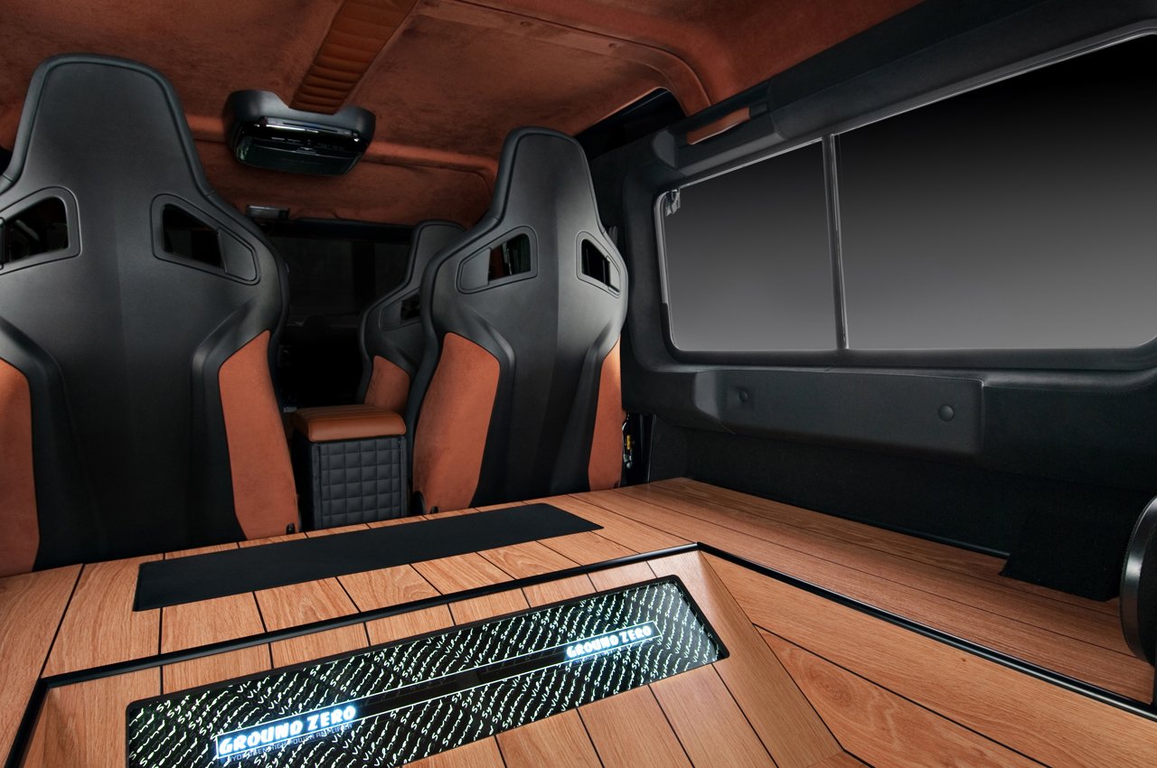 V interiéru Land Roveru Defender Wood tedy najdeme: sportovní sedačky (vzhledem k zaměření vozu asi trochu nadbytečné), čalounění v hnědo-černé kombinaci kůže Napa, kožené potahy loketní opěrky, alcantarou obšité prakticky vše, co obšít šlo (i třetí brzdové světlo a vnitřní zpětné zrcátko), podlahu obkládanou dřevem a v zavazadlovém prostoru, který tím trochu ztratil svoji funkci, audiosystém Ground Zero o výkonu 600 W. Ten je nejspíše důvodem, proč je celá kabina důkladně odhlučněná. Pasažéři si navíc můžou užívat videa z DVD přehrávače na patnáctipalcové obrazovce. O ceně tisková zpráva nehovoří a je to tak možná lepší.