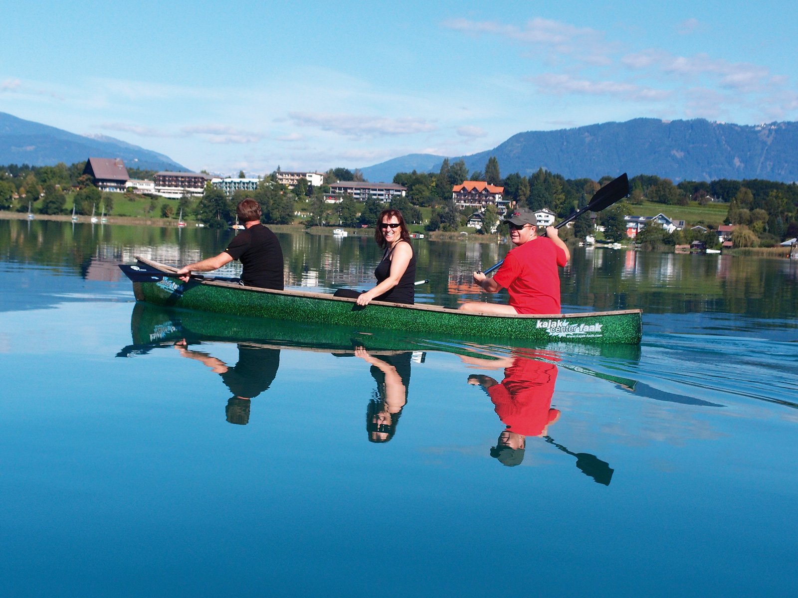Žádné jiné korutanské jezero nemá tak azurově modrou barvu. Odkládáme kola a volíme jiný dopravní prostředek. Půjčujeme si otevřené kánoe, abychom si jezero prohlédli v celé jeho kráse. Míjíme ostrůvek s romantickým hotelem a na druhém konci jezera se proplétáme prosekaným rákosím k místu, kde voda z jezera vytéká. Je to šikovný nápad, pádlování po jezeře by bylo nudné, tady si alespoň všichni vyzkoušíme, zda skutečně umíme s lodí manipulovat.