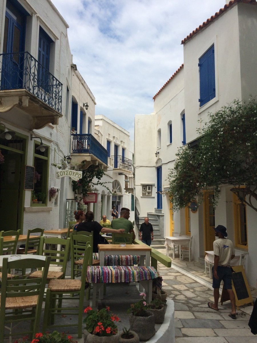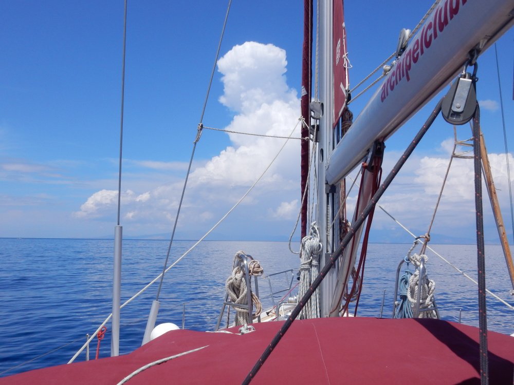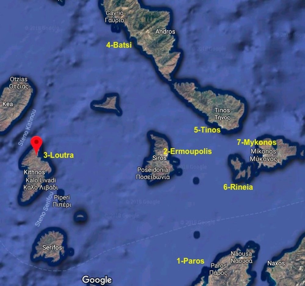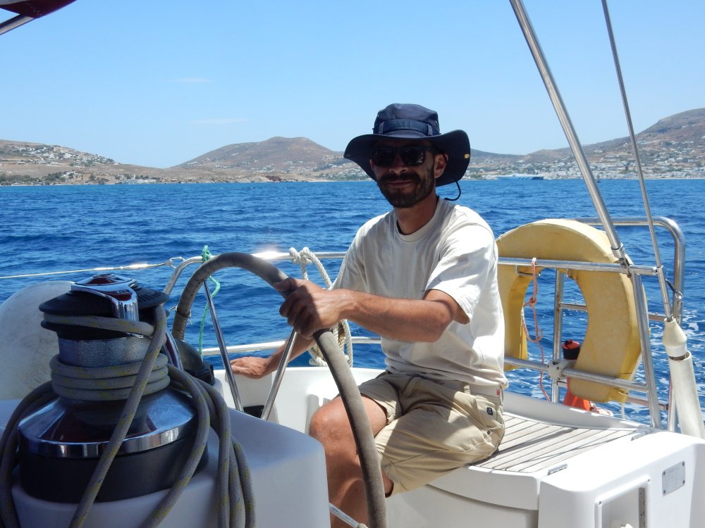 Když mi zavolal kamarád, že nás zve na plavbu po Kykládách neváhali jsme ani minutu. Koupili jsme si letenky do Athén a lodní lístek na ostrov Paros, kde jsme se sešli s naším přítelem a jeho dcerami a řeckým kapitánem Jasonem. Šestnácti metrová jachta Archipel s fialovočervenými plachtami byla již připravena k odplutí, všude byly krabice s potravinami a ovocem a kapitán se připravoval na krátkou přednášku, aby nám suchozemcům vysvětlil pravidla plavby. Nikdo z nás není nováčkem na plachetnici a tak jsme vjeli docela brzo. Mířili jsme k Parosu na největší z ostrovů Siros(ASyros). Měli jsme příznivý vítr a před sebou asi 40 námořních mil ( 1 míle je 1800 m), V podvečer jsme přistáli v hlavním městě Kyklád, Ermoupolis . Všude je vidět vliv benátské republiky, které ostrov po staletí patřil. Zajímavostí jsou dva vrcholy nad městem. Na jednom je katolická katedrála, která vypadá jako pevnost a vedle chrámu je campanula s nádhernou zvonkohrou, také vliv Benátek. Na druhém kopci je ortodoxní katedrála řecko-katolická. Večer jdeme s Jasonem do taverny k jeho kamarádům. Taverna má stolky přímo na ulici, a Jason hraje na buzuku, zajímavý nástroj podobný malé mandolíně, místní odrhovačky. Ostrov není doposud turisticky zajímavý. Ráno fouká dost silný vítr, skoro 60 uzlů. (30 km/hod) a vyplouváme k dalšímu ostrovu Kythos. Počasí není nic moc, moře je bouřlivé, z plánovaného koupání nic není, vítr sílí a na obzoru se objevuje blížící se tornádo a tak jsme rádi, když po několika dalších hodinách přistáváme v přístavu Lutra. Zajímavostí Lutry mají být termální prameny, ale lázně jsou zdevastované a horká sirnatá voda vytéká rovnou do moře.