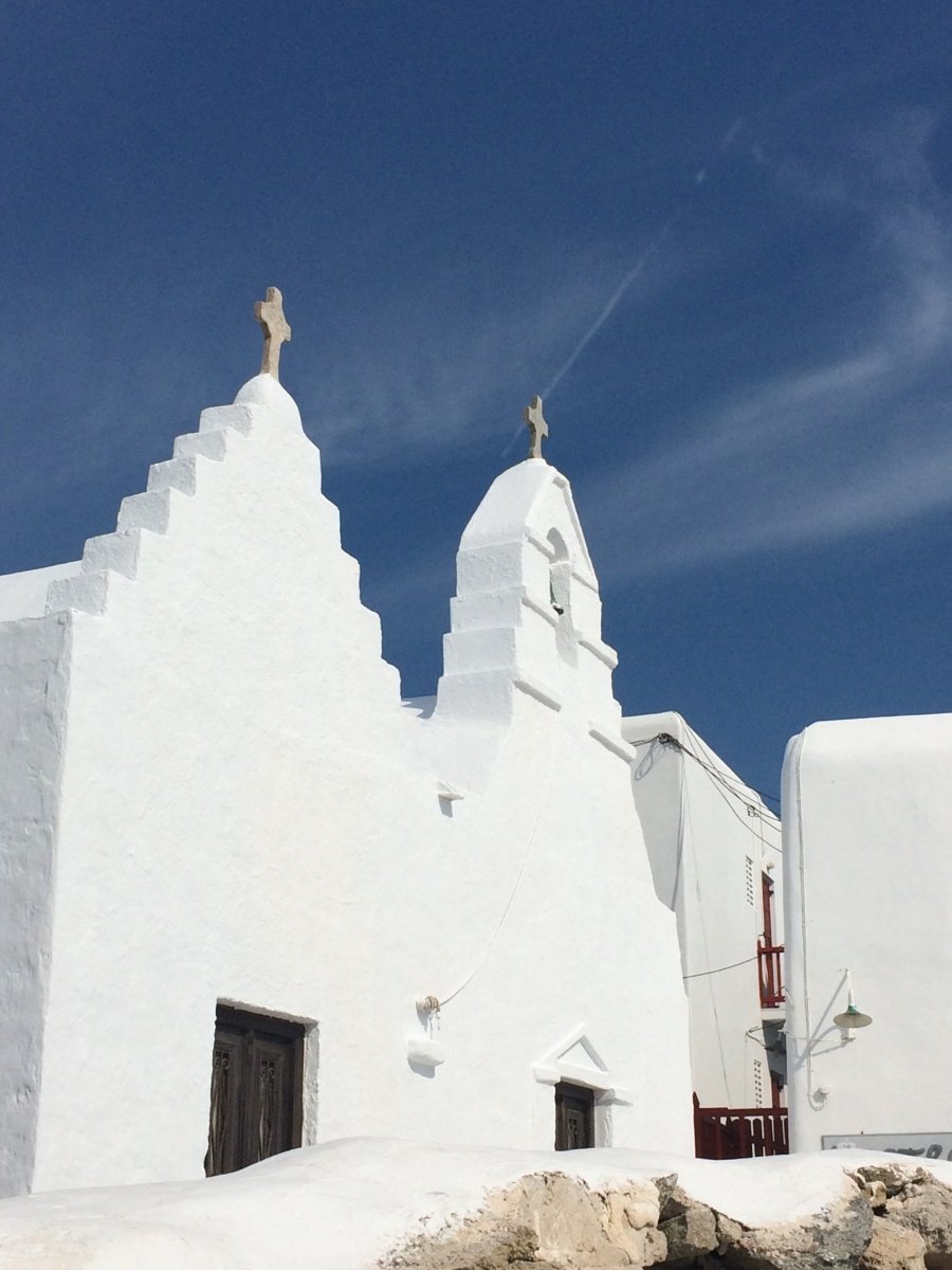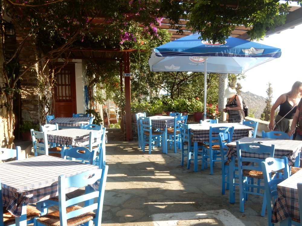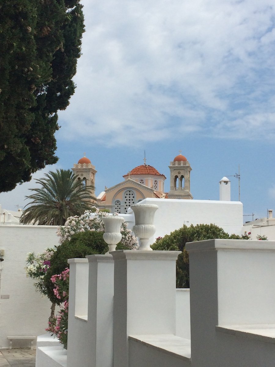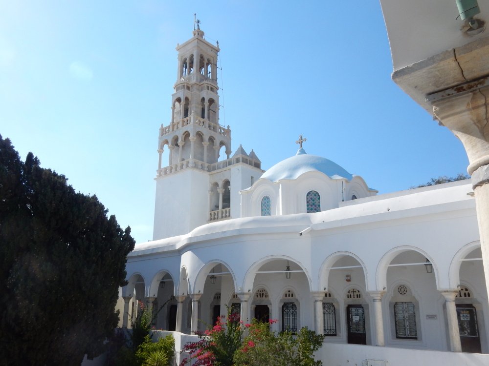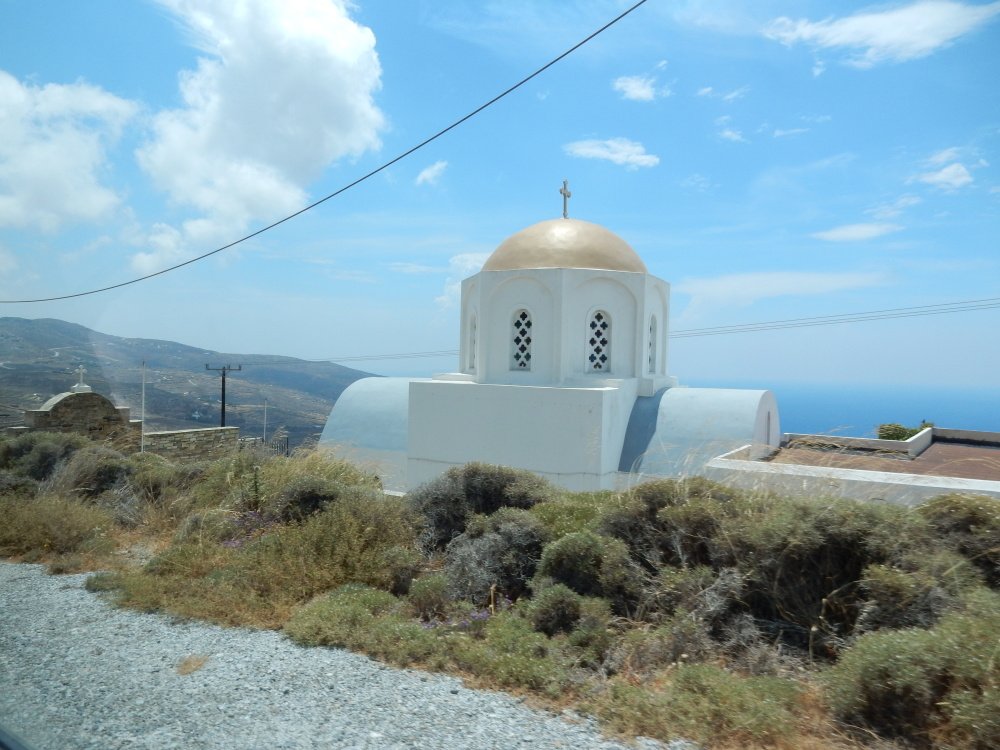 Další ráno plachtíme k ostrovu Tinos, přístav a město je veliké, je to řecké poutní místo, kde je největší ortodoxní katedrála Virgin Mary/Tiniotissa/Evangelistria. Jdeme nahoru po ulici, po které vkleče lezou poutníci 2x ročně 25.3. a 15.8. prosit za uzdravení, do kostela, který je úžasný. Řecko- katolická výzdoba je ovšem strašidelná. V katedrále je malá kaple na památku námořníků, kteří v roce 1940 zahynuli, když řeckou loď Elli v příistavu torpedovala italská ponorka. Tento den je považován za začátek války mezi Italii a Řeckem. Námořníci šli do kostela, bylo to právě 15. 8. A tak se jich většina zachránila. Na večeri jedeme do horské vesničky Ktikados, která je jak v pohádce tisíce a jedné noci. Několik kostelů v byzantském stylu, políčka a zavlažovací kanály v prudkých stráních, zajímavé stavby, ve kterých se pěstovalipoštovní holubi, výhledy na moře a taverna s terasou a skvělým jídlem. Ostrov Tinos je znám největším lomy na mramor. Ten zelený se pouze vyváží a z bílého se staví. I autobusová zastávka byla z mramoru. Vnitrozemí ostrovů ukrývá skutečně zajímavá místa. Zatím, ani jeden z ostrovů nebyl významný pro organizovanou turistiku.