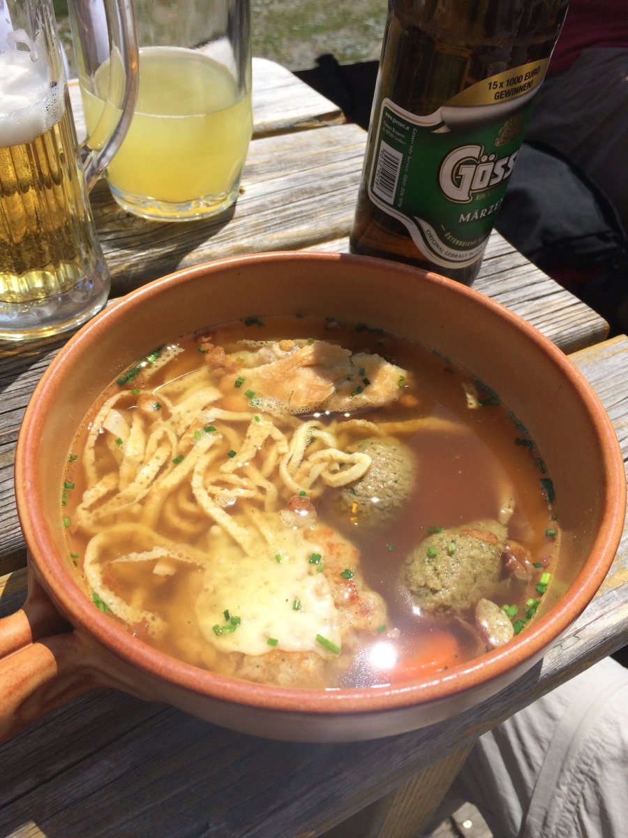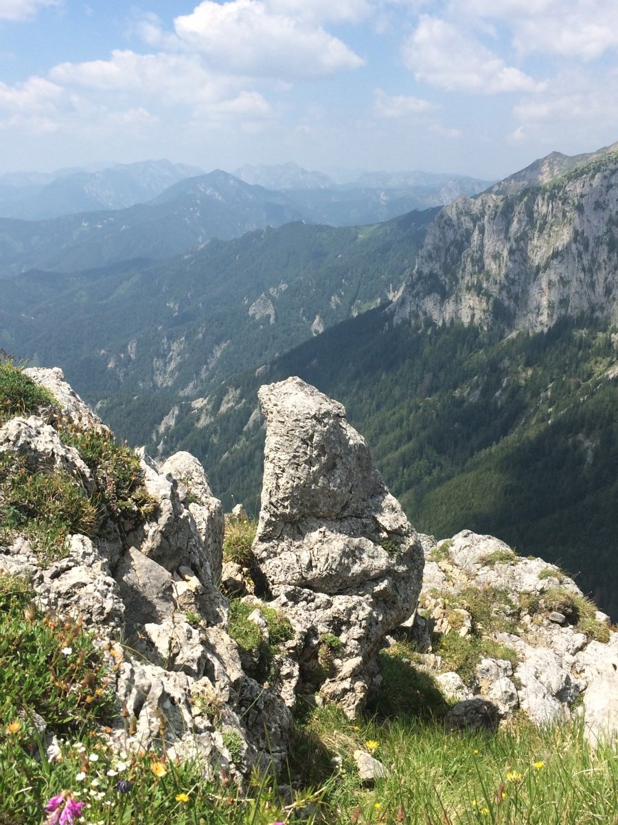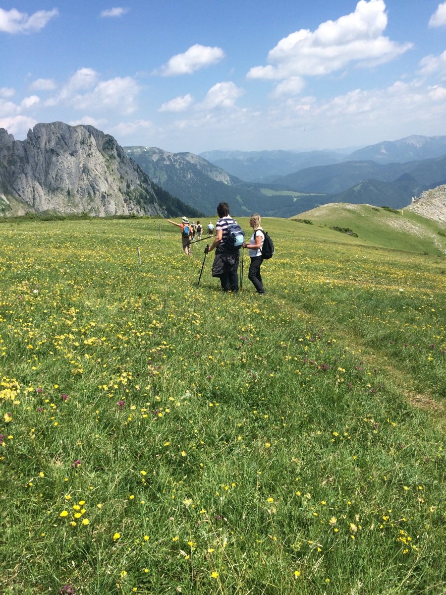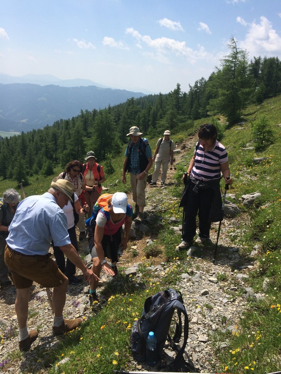Třetí den jsme měli naplánovanou tůru na Hochschwab. Z Leobenu jsme pokračovali do horské vesnice Aflenz. Nad ní se rozkládá, rozlehlá alpská planina Bürgeralm (1510 m n.m.) , která je v létě dostupná po silnici, na které se platí mýtné a v zimě jen lanovkou. Je výchozím místem na vysokohorské tůry v pohoří Hochschwab, především na stejnojmenný vrchol ve výšce 2 277 m n.m. Čekala nás sympatická paní Regina, botanička, která nám slíbila, že nás zavede na tajemné místo, kde uvidíme alpskou protěž. Tahle sametově zbarvená květinka je symbolem hor a patří k nejstřeženějším a nejhledanějším květinám ve všech pohořích Evropy. Odolat touze si protěž utrhnout dá hodně přemáhání. Cestou jsme obdivovali množství alpských orchidejí, ale také arniku, hořce a další květiny, které jsme neznali. Bürgeralm patří k nejvýznamnějším alpským květinovým regionům. Na závěr jsme došli k chatě Schönleutenhaus (1810 m. n. ).. Zvenku vypadá jako horská salaš, ale uvnitř najdete téměř luxusní ubytování a především báječnou kuchyň. Sestup diretisimou k autu nebyl už tak příjemný, ale celodenní túra byla zajímavá. Na začátku jsme se trochu obávali, že botanická přednáška v němčině bude únavná, že nikam nedojdeme, ale paní Regina byla především zdatnou chodkyní a pětihodinová tůra nám dala zabrat. Přenocovali jsme v příjemném penzionu Petershof a večeři jsme si dali v hotelu Post, který nabízí místní speciality a zvěřinu.