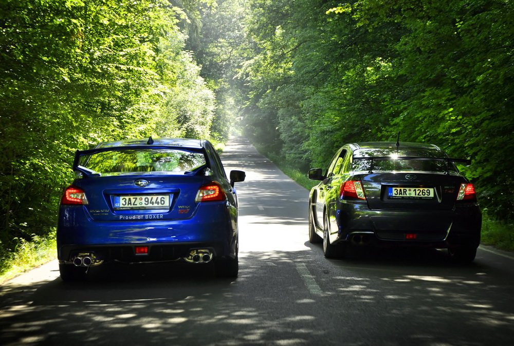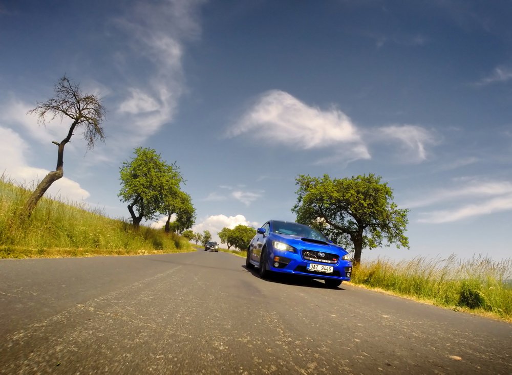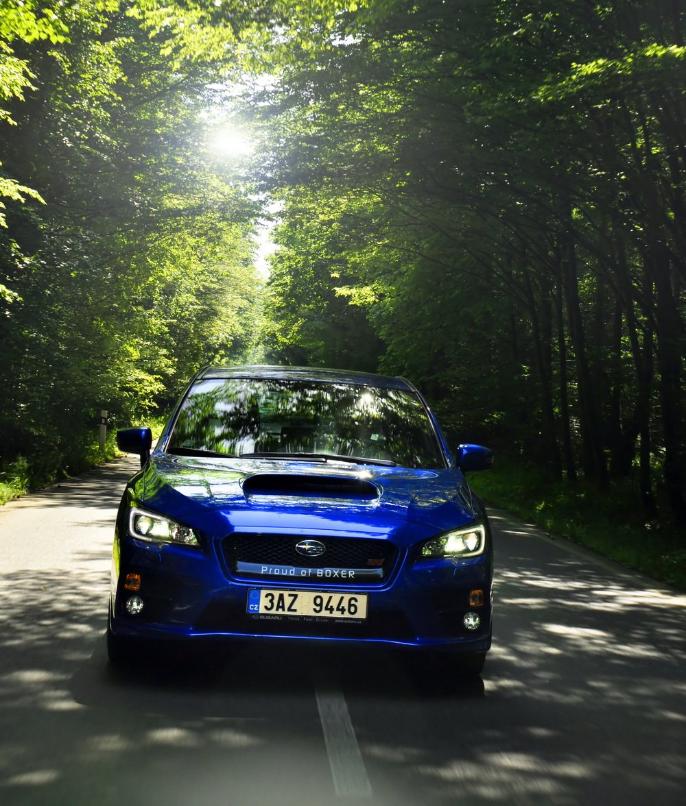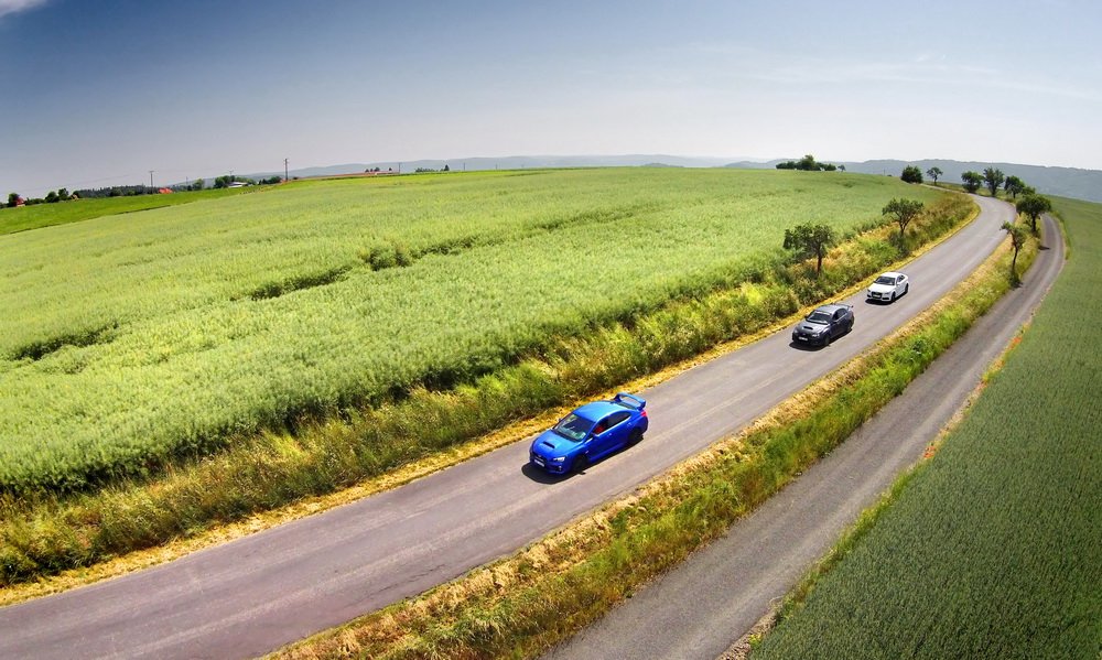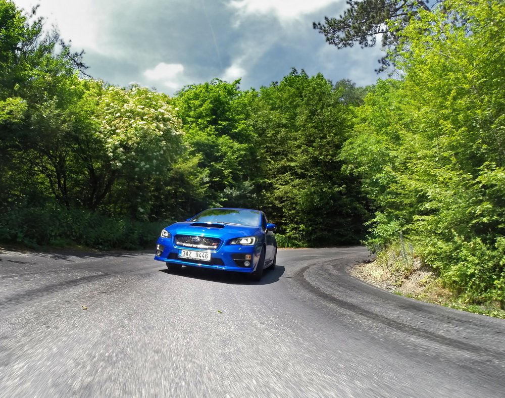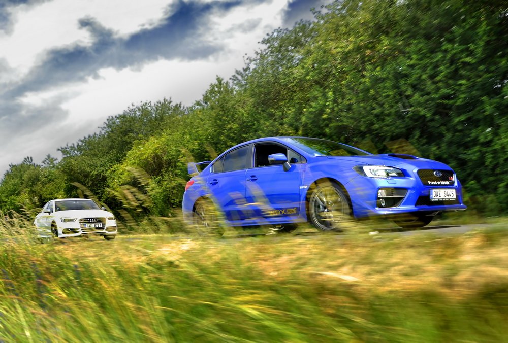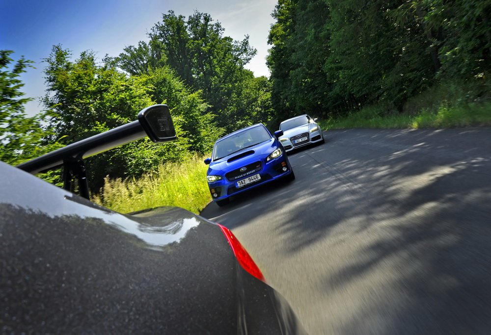 Končí vesnice, začíná hluboký les a v něm natažená silnice. V novém WRX STI sedí Lukáš, já za ním v S3 a poslední následuje starší WRX STI, spíš jako doprovod. Je mi jasné, co Lukáš udělá jako první za značkou oznamující konec vesnice. Šlápne na to. A já také. Oba máme přeplňované čtyřválce, Subaru je ale samozřejmě plochý a má a 0,5 l objemu navíc. Jde o stejnou jednotku, jakou používá i starší model. Všichni tři disponujeme výkonem 300 k.