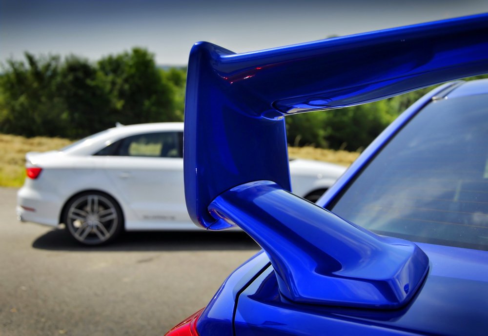 Proč? Je to dáno jeho stylem. Je prostě nenápadné, působí spíš jen jako další motorizace nové A3. Poznáte ho jen díky výfukům a upravené masce chladiče. To Subaru je pěkný pozér, ať už jde o novou, nebo starší generaci. Svaly dává najevo tak velkým křídlem na zádi, že bych si ho odřízl a vyrobil z něj lavičku na zahrádku. Na přídi nechybí mohutný nasávací otvor a zadní výfuky vypouští děs, už když se auta pomalu plíží Berounem.