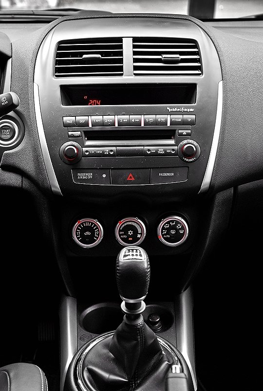 Zevnějškem tedy oba vozy sází na první dojem, uvnitř tomu ale tak není. Japonec se od Francouze přísně odlišuje (také zde platí, že obě automobilky šly úplně jinou cestou). ASX má totiž velmi jednoduše pojatou palubní desku s několika ovládacími prvky. Mísí se tu tvrdý a měkký plast, vše je na svém místě jak má. Relativně malý volant nám velmi dobře padl do ruky, zvlášť když byl potažen pohodlnou kůží, řadicí páka by mohla mít trochu lepší tvarování. Přístroje jsou v samostatných tubusech a přidávají trochu na sportovním duchu, celkově je ale palubovka spíše nudnou záležitostí.