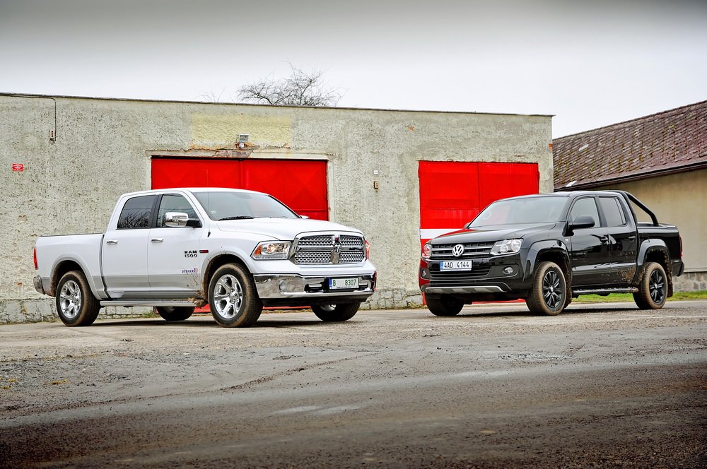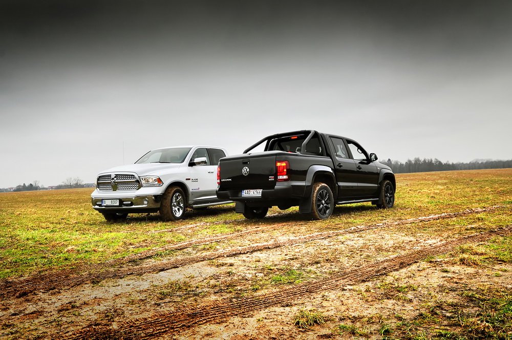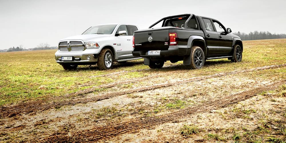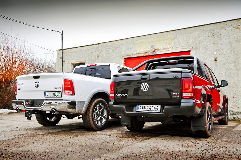 RAM se se svou délkou přesahujících 5,8 metru a šířkou přes dva metry zdá být na českých silnicích gigantický, jenž model 1500 je v USA tím nejmenším, který si můžete vybrat. Na větší verze byste už u nás potřebovali řidičák na náklaďák, a tak se sem vozí ještě v menším než malém množství. Soupeřící Volkswagen Amarok je z hlediska segmentu pick-upů v Evropě špičkou. Pokud ho uvidíte samotný, bude se vám zdát také velký. Má na to i slušnou délku 5,25 metru. Postavte ho vedle RAMu a najednou zjistíte, jak jste se mýlili. Zdá se, že začíná souboj Davida s Goliášem.