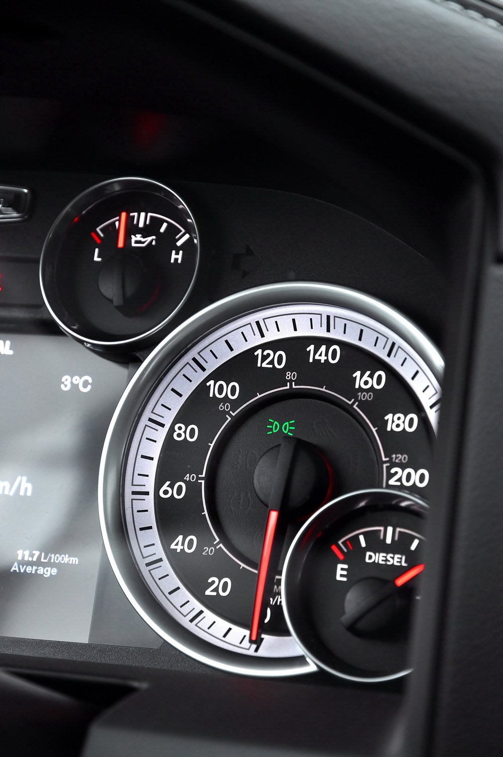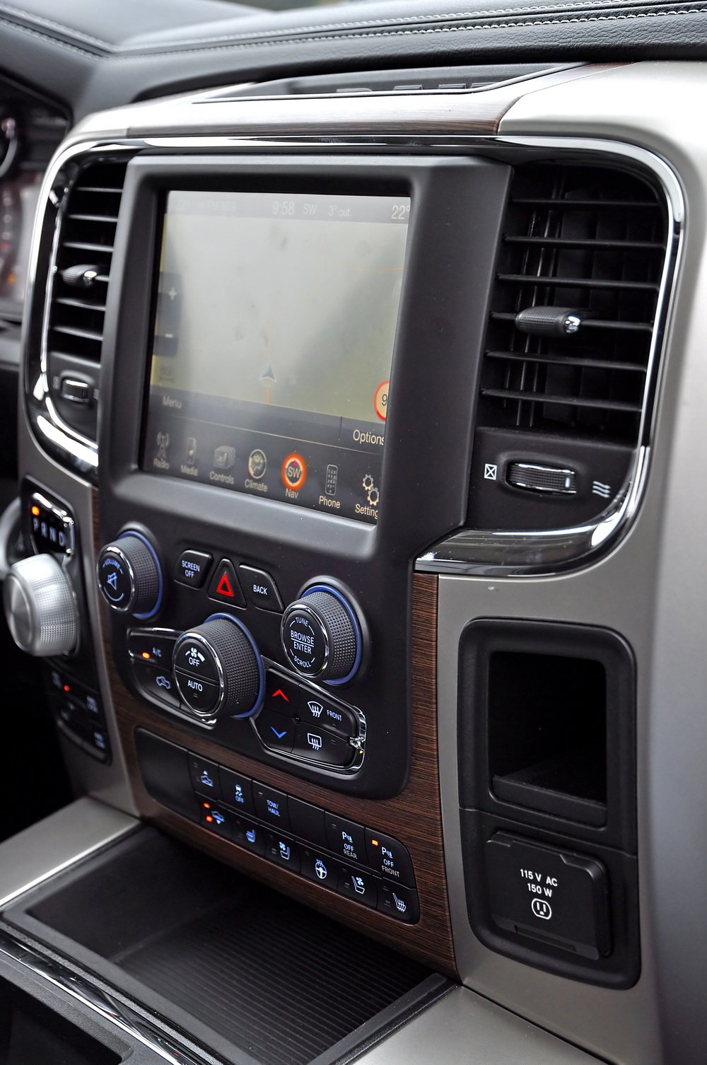 To RAM je naprosto něco jiného. Odmyslím-li si těch pár čtverečních centimetrů odporného plastu napodobujícího dřevo (v Americe se tento styl asi zřejmě ještě nosí), je hájemství řidičovo naprostým luxusem. Všude najdete obrovské množství odkládacích prostor. Středovému panelu vévodí velká obrazovka s dotykovým displejem známá z Jeepu, ale i Fiatu a Maserati. Navigace je sice pomalejší a s hrubší grafikou, ale na rozdíl od Amaroku alespoň nějaká vůbec je. Mezi přístroji trůní další displej palubního počítače. Hlavní ale je, že se sedí proklatě vysoko. Na okolní vozy včetně Amaroku se díváte jako z rozhledny na Ještědu. Ještě k tomu před sebou pozorujete tu obrovskou příď. Dostavuje se pocit nadvlády nad ostatními. Jak opojné…