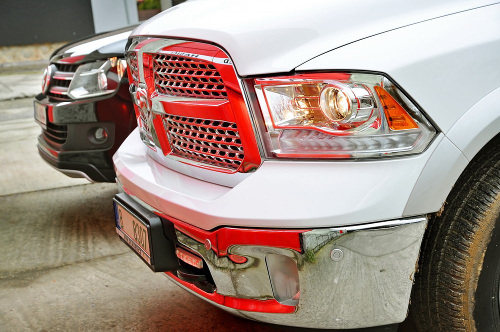 Všechna pozornost samozřejmě padá na RAM, protože je v Česku považován za exota, zatímco Amaroku se loni prodalo přes 100 kusů. Občas na něj tedy narazíte. Další výhodou se zdá být obrovské množství chromu, kterým Američan disponuje. Najdete ho na gigantické negativně zkosené přídi, nárazníku, zpětných zrcátkách, kolech i nástupním prahu. Auto se zkrátka leskne jako obrovský dárek zabalený do alobalu. Vše ještě umocňuje bílý lak.