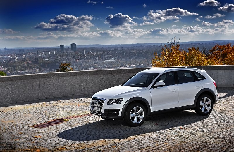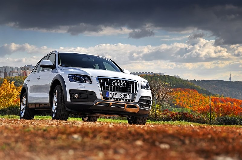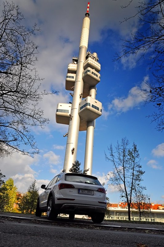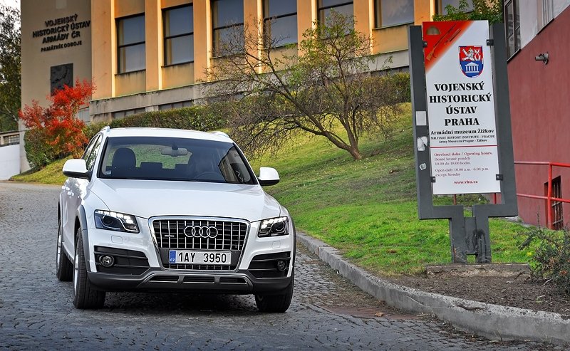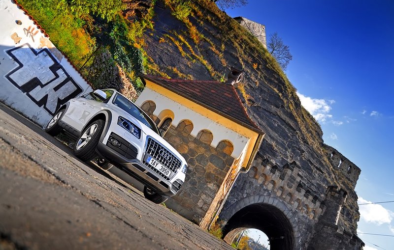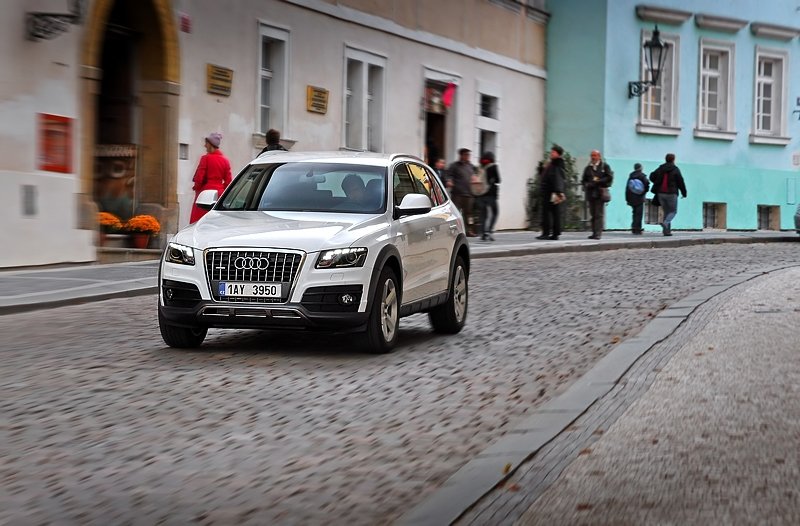 Podzimní výlet stověžatou Prahou začal na Smíchově, kde jsem si převzal klíček od Audi Q5 vybaveného naftovým dvoulitrem o výkonu 170 k a samočinnou sedmistupňovou převodovkou. Jde o druhou variantu motoru 2.0 TDI v nabídce. K dostání je ještě slabší provedení s maximem 143 k (vrchol tvoří velmi dobrý šestiválec 3.0 TDI). Zmenšenina obrovského SUV Q7 přišla na trh před dvěma lety a úspěšně si zde získala stálou pozici. Není se nakonec čemu divit, design německého prémiového kompaktu je povedený, dokonce menší vůz vypadá lépe než větší a trochu neohrabaně působící brácha. Testovaný kousek byl navíc vybaven příplatkovým paketem Offroad Style. Ten zahrnoval upravený přední nárazník s ochranou podvozku, oplastované prahy a blatníky a kovovou spodní část zadního nárazníku. My ovšem do terénu namířeno nemáme, nicméně při jízdě po městě se takové doplňky určitě také hodí.