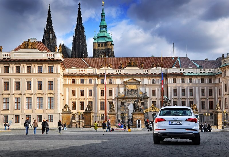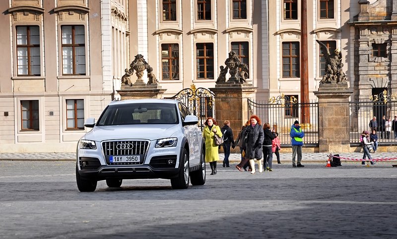 Opět nám postačí pár minut k tomu, abychom se přesunuli na místo turisticky nejatraktivnější – na Pražský hrad. Protože je krásné počasí, je zde “hlava na hlavě“. Spousta návštěvníků si chce z blízka prohlédnout dominantu našeho hlavního města. Prémiové kompaktní SUV se k této prémiové kulise skvěle hodí (přestože má vizáž offroadu). Zřejmě to je jeden z klíčů k úspěchu modelu Q5. Všestranné kvality, díky kterým okázale zaparkujete na společenské akci, abyste se před víkendem se stejným automobilem hrabali blátem k chatě.