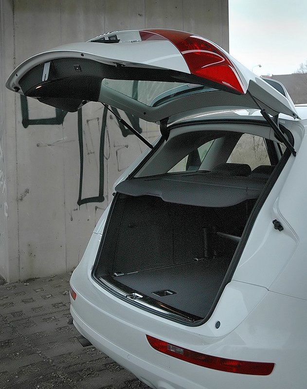 Zadní část se designérům hodně povedla. LED umístěné pod čirými skly vypadají opravdu pěkně a stejně hezky navazují i na řez s logem, pod nímž se skrývá příplatková couvací kamera. Audi Q5 používá stejný systém vyklápění víka zavazadelníku, jako Q7 – světla se zvednou spolu s dveřmi, což působí dojmem, že máme k nakládce mnohem více místa. Uvnitř kufru najdeme systém posuvných držáků, který brání pohybu menších předmětů v kufru. Na ně máme vymezeno 540 litrů, což je nadprůměrná hodnota, po sklopení je pak k dispozici 1560 litrů.