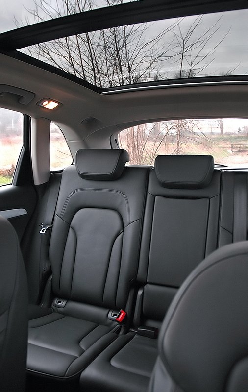 Audi Q5 nepřekvapí velmi dobrou prostorností, to se očekává i od menších SUV. Na sedadlech potažených černou kůží se sedělo opravdu pohodlně díky množství možností elektrického nastavení. Řidiče dobře obejmou a mají tak perfektní boční vedení – tím se zvyšuje i pocit sportovnosti. Vzadu je místa opravdu maximum, na prostor před koleny si nemohou stěžovat ani vyložení dlouháni. Na prostředního pátého cestujícího ale zapomeňte – nevejde se sem rameny, nohám brání zvednutá podlaha a to nemluvě o tvrdé loketní opěrce, která by ho tlačila do zad.