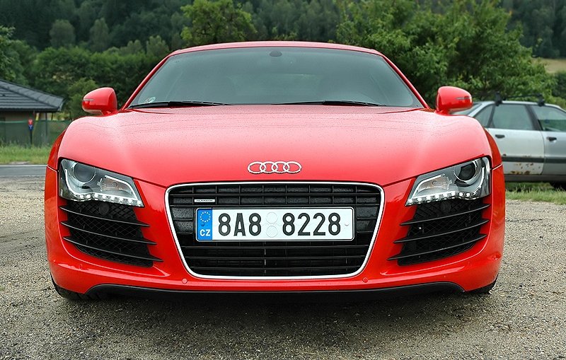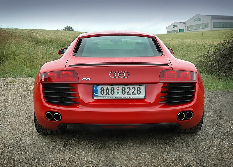 Audi R8 budí na fotografiích trochu jiný dojem, než ve skutečnosti. Je to dáno jejím tvarem – mohutnou oblou přídí, výškou pouhých 1249 mm kontrastující s koly velikost 18“, které obují pneumatiky 35/40 R18 vpředu a 285/35 R18 vzadu. A pak tu máme prosklenou záď. Ta nabízí úchvatný pohled na motor. Má čtyři kruhové svítilny, čtyři koncovky výfuku a výdechy přeříznuté čtyřmi žiletkami.