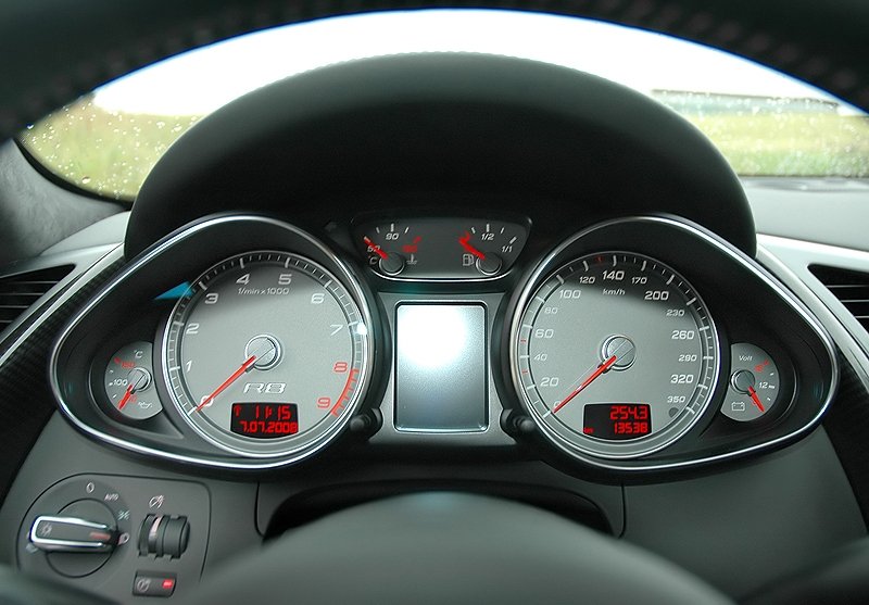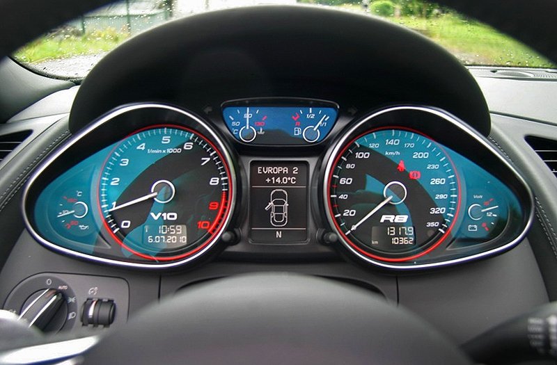 R8 má přehledné budíky, rychloměr cejchovaný do 350 km/h. Na bližší zkoumání navigace, klimatizace a dalších nesmyslů nemám ani vteřinu času. Zarazím se je u páky automatické šestistupňové převodovky R-Tronic, na kterou si musíte ze začátku zvyknout. Jde vlastně o takový velký tuhý joystick, který se hýbe v křížové kulise a tím mění buď automat, neutrál a zpátečku, nebo manuálně mění převod.