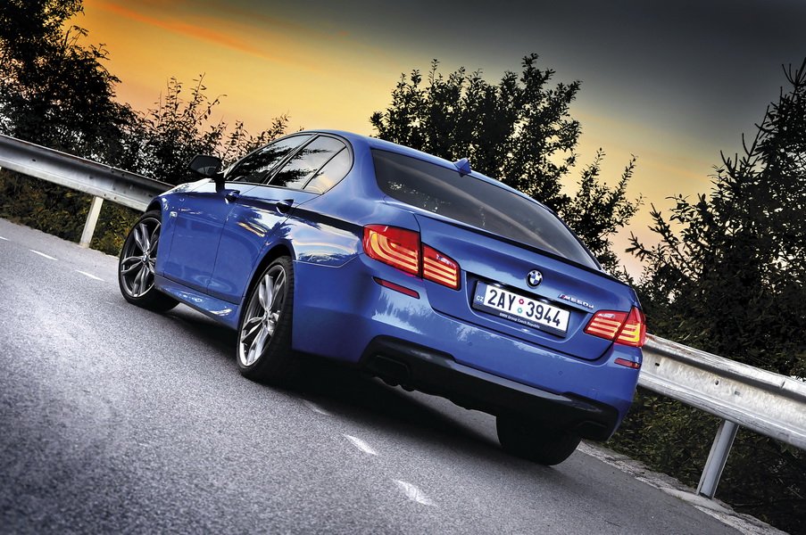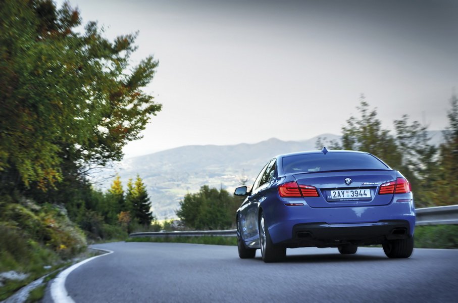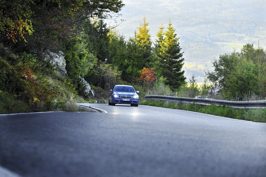 Jenže M by mělo být skvělé i v zatáčkách. A tady už M550d selhává. Vinu na tom nese nejen vysoká hmotnost, ale i určitá topornost vozu. Řidič ví, že si hraje s velkým automobilem a zároveň musí chápat, že si nemůže dovolit skotačit třeba jízdou bokem napřed. Pokud chcete po naftě ostré reakce při jízdě stylem plyn-brzda-plyn, neuspějete. Chování, které se vám z vozu podaří dostat, je sice nadprůměrné, ale o nic lepší než u běžného naftového BMW 5.