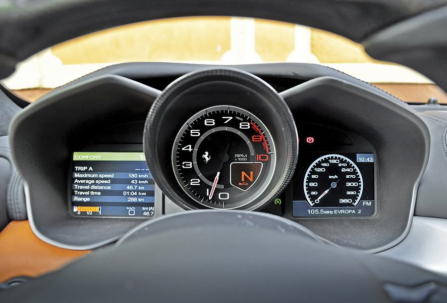 Chování „efefka“ záleží na tom, jak si budete pohrávat s otočným ovladačem na volantu zvaným Manettino. Ten nabízí hned několik jízdních režimů. Protože jde o automobil z kategorie GT, chybí volba Race, kterou najdete třeba u modelu 458. Místo toho tu jsou dva bezpečné režimy na sníh a mokro. Jezdit můžete i v režimu komfortním a pro drsnou jízdu lze zvolit režim Sport nebo odpojit ESC. Pokud však nejste zkušení, raději to hned nedělejte.