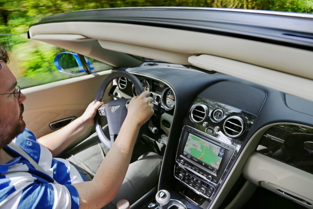 Prodejci elektromobilů často rádi upozorňují, že jejich auta mají prakticky okamžitý nástup točivého momentu. Bentley ale může tvrdit totéž. Sešlápněte plyn, reaktor do výfuku zabublá a Continental vyletí kupředu, jako kdyby ho vystřelili katapultem z letadlové lodi. Kabriolet je kvůli výztuhám o 175 kilo těžší než kupé, ani to mu ale nebrání v tom, aby pokořil stovku za bleskových 4,4 sekundy. Maximálně zvládne letět až 327 km/h, čímž se stává nejrychlejším kabrioletem světa. Rychleji jezdí už jen dvoumístné roadstery, ale i tak vás mohu ujistit, že jich mnoho není.