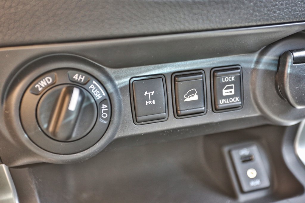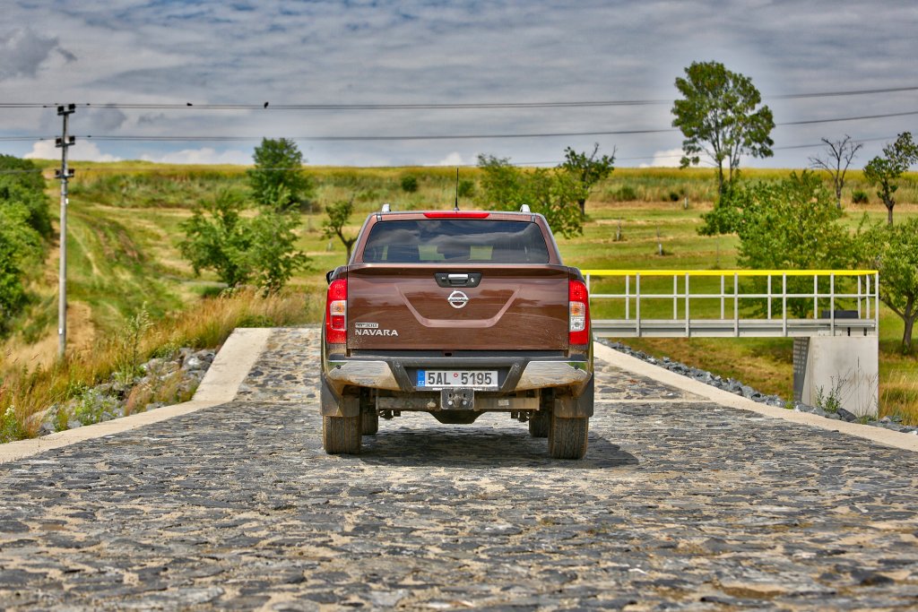 Velké pick-upy s pohonem zadních kol mívají nervózní záď, zvláště když nejsou naložené. Proto se občas na korbách testovacích pick-upů setkávám se závažím, aby se chovaly stejně jako při zatížení. Navara takové triky nepraktikuje. V zatáčkách se i bez zatížení chová sebejistě a její záď neuskakuje. Na mokrém či kluzkém povrchu se mi osvědčilo aktivovat pohon všech kol pomocí otočného knoflíku na spodní části středového panelu, kdy se k pohonu zadních kol přiřazují i přední kola. Další pozice spínače zařadí redukční převod a obří pick-up může stoupat do pořádného krpálu. Stejně tak v tomto režimu není problém rychlostí schůze sjíždět strmé svahy (asistent sjíždění svahu tak v praxi ani nevyužijete). Na velmi kluzkých površích přijde vhod elektronická uzávěrka zadního diferenciálu, ovládaná tlačítkem. Ta přijde v testovaném provedení na necelých dvacet tisíc, u čistě pracovní základní verze s listovými pery je dodávána standardně.