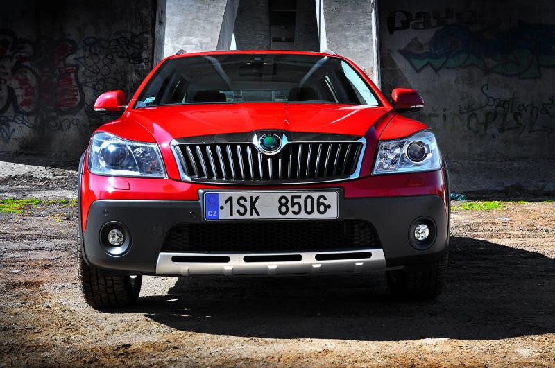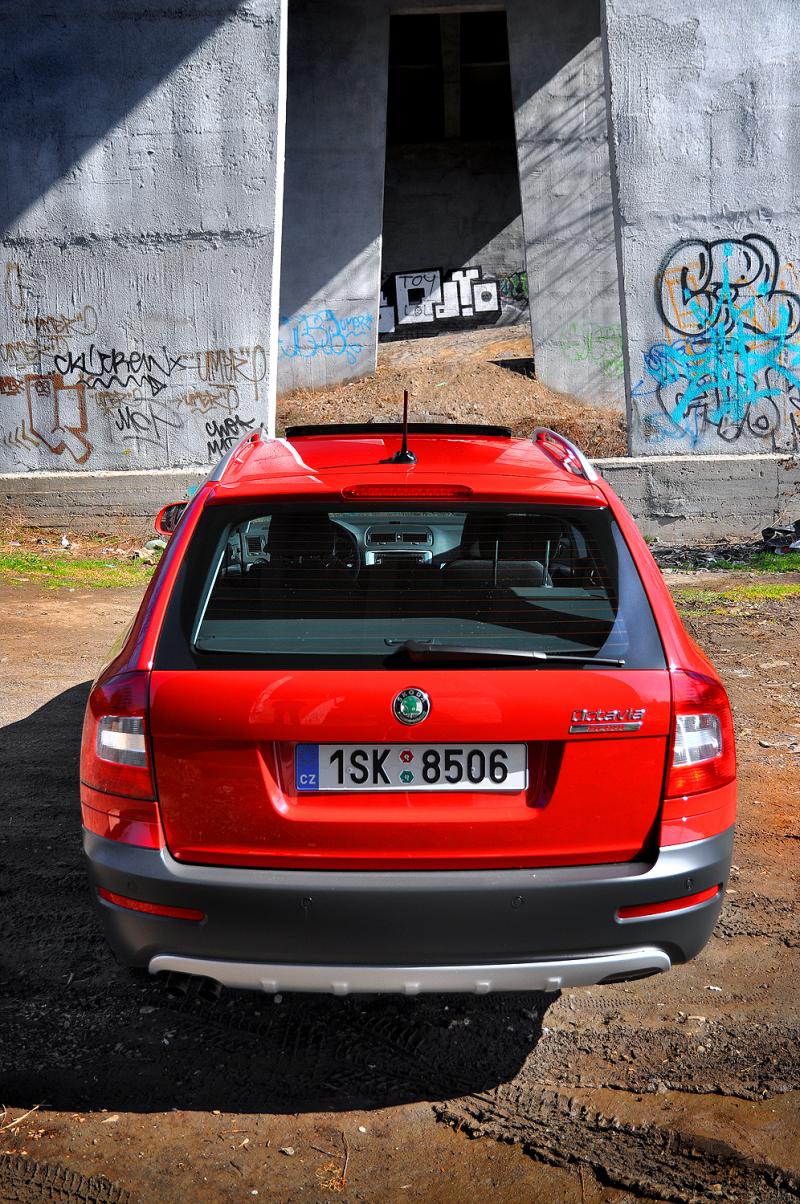 Popisovat vizáž populární Oktávky by bylo nošením dříví do lesa. Facelift přiblížil její tvář novějším modelům, zejména vlajkové lodi Superb, zároveň ale z uměřeného, až seversky elegantního designu udělal tak trochu Asiatku. Jednoduše tvarované světlomety před faceliftem se nám líbily o něco více než současné protažené, zbytek vozu ale zůstal naštěstí víceméně nedotčen. Kombinace pastelové červené Corrida a stříbrných ližin je povedená, tmavošedé plastové lemy se stříbřenými imitacemi ochranných plechů vpředu a vzadu dávají autu skutečně robustní vzhled. Trochu zvláštní je dvojitá koncovka výfuku vlevo a zaslepený výkroj v pravé části nárazníku. Zvětšená světlá výška je na první pohled patrná, pohledná sedmnáctipalcová litá kola ale vyniknou i tak.