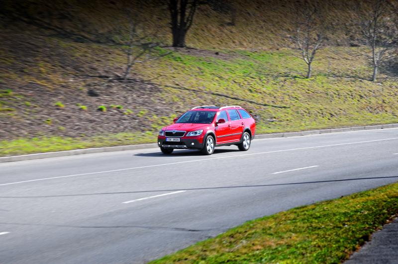 Je však třeba říct, že Octavia Scout má pro takto žíznivou náturu jisté opodstatnění, a tím je kromě zvýšené stavby také pohon všech kol a s tím související vyšší hmotnost. Škodovka staví na osvědčené klasice v podobě spojky Haldex řízené elektronikou. Ta přenáší točivý moment na jednotlivé nápravy podle potřeby a při klidnější jízdě na silnici v dobrých adhezních podmínkách tak zadní kola dostávají jen zlomek procenta. Jakmile je však třeba a senzory vyhodnotí blížící se mezní situaci, systém bleskově zatíží příslušná kola dostatečnou porcí síly a auto tak nemá problém s mokrou vozovkou ani drobným štěrkem, který silničáři zapomněli zamést.