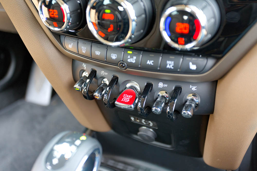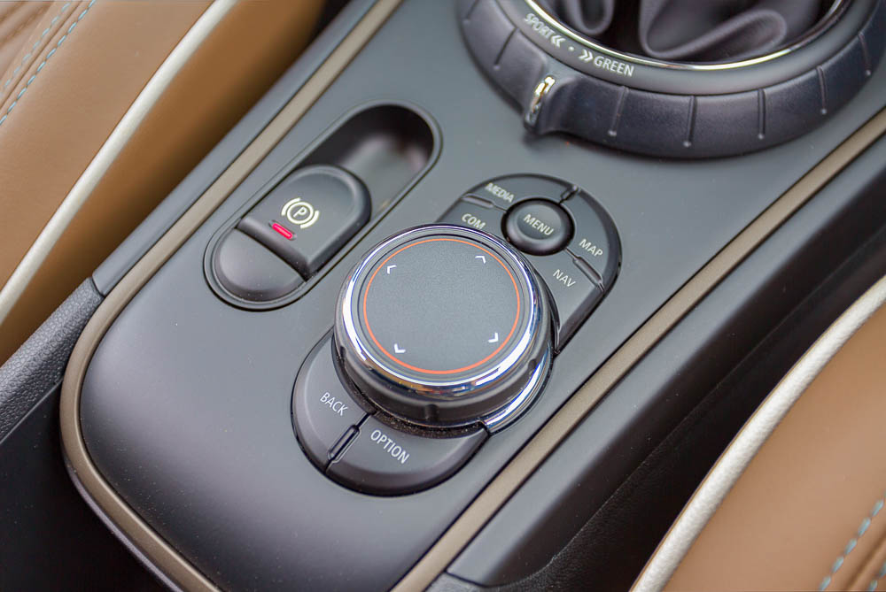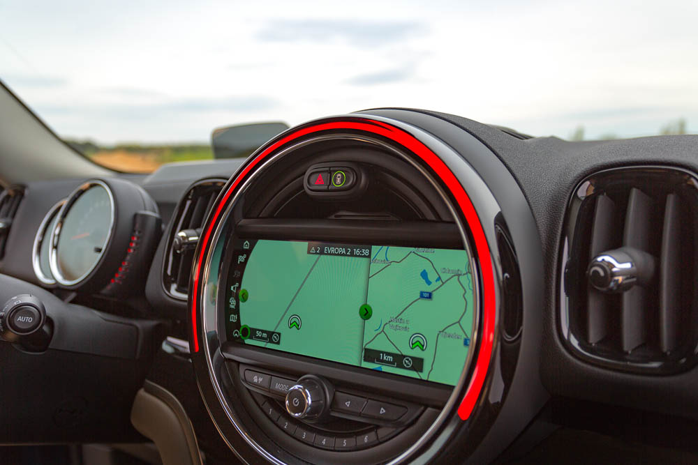 V kabině překvapí hned tři hnědé barvy – jiný odstín má palubka, jiný výplně dveří či sedadla. V MINI použili i celou řadu různorodých plastů, které se liší nejen barvou, ale i strukturou. Středobodem palubní desky je kruhové provedení centrálního displeje, u kterého je na první pohled zřejmé, že pochází z BMW včetně typického ovladače umístěného na středovém panelu. Chápu, že právě tyto dva prvky jsou u zákazníků žádané, osobně bych se bez nich obešel a raději civěl na pořádný rychloměr jako u původních MINI. Kýčovitě na mě působilo duhové podsvícení lemu centrálního displeje, oranžovo-červené podbarvení přístrojů a fialové ambientní podsvícení. Na druhé straně se právě takto provedené podsvícení celé řadě lidí líbilo a říkali, že k MINI to patří. No, nevím. V noci tato diskotéka nebyla nic příjemného.