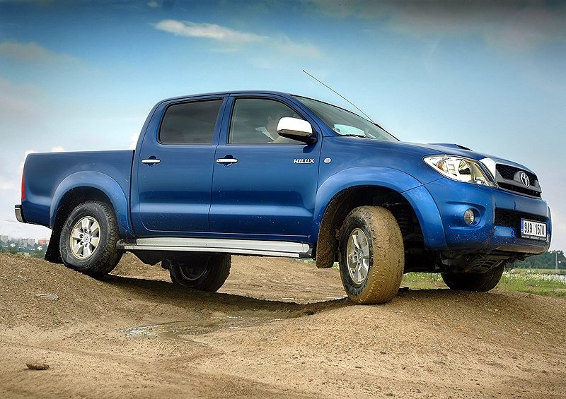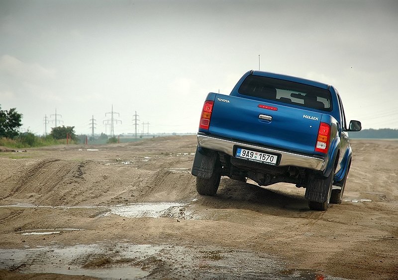 Jak už to tak bývá, každá mince má dvě strany. Z toho, co vám bude na silnici vadit, budete mít v terénu radost. Toyota Hilux využívá klasickou konstrukci. Karoserie stojí na žebřinovém rámu. Výrobce navíc vybavil příčné nosníky zesílenými spoji a zvýšil tak celkovou robustnost. Přední náprava dostala dvojité lichoběžníkové zavěšení, zadní tuhá využívá, jak už bylo řečeno, listová pera. Výkon naftového motoru je přenášen na zadní kola, přední pohon je manuálně připojitelný, nechybí ani redukční převodovka, uzávěrka diferenciálů, světlá výška přes 200 mm a příkladné nájezdové úhly. Tolik teorie.