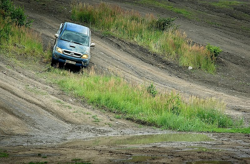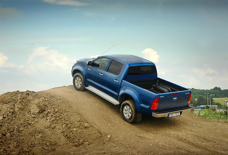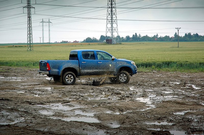 Že Toyotu Hilux v terénu nic nezastaví? To jsem možná trochu přehnal a trochu jsem jí fandil. Najít překážku, která by byla pro tento vůz nepřekonatelná, nebylo až tak těžké a při našem řádění na trati Hummercentra jsme na ni narazili už po deseti minutách. Jedinou věcí, která v terénu způsobuje problémy, je délka vozidla a velká vzdálenost náprav. Tuto nevýhodu ještě podtrhnou hliníkové boční stupačky. Stačil jeden podrobný pohled na ně a bylo jasné, že na podobný problém narazilo více lidí, kteří měli Hilux před námi. Brzy jsme zjistili, že je potřeba dávat velký pozor při přejezdu ostrých zlomů a nerovností. Přes vše ostatní se Hilux valí jako tank.