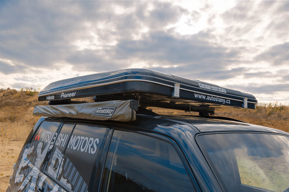 S dovybaveným Pajerem můžete vyrazit do nehostinných podmínek či jen zůstat v Česku a poznávat neobjevená místa. Můžete v Alpách přeskakovat přes kameny korytem řeky, můžete vyzvat na souboj písečné duny, můžete se prát s tundrou, a to bez výraznějšího omezení. Do Pajera jednoduše nasoukáte kempingové vybavení, věci na sebe, zásoby jídla a vyrazíte. Hotelový pokoj si vezete na střeše a v případě potřeby ho rozložíte za dvě minuty. Nemusíte čekat na recepci, nemusíte se přetahovat o volné místo a nemusíte nic řešit. Jen zastavíte, odjistíte tři přezky, zatočíte lehce klikou a nasadíte pro pohodlný přístup žebřík. Matrace, polštářky i přikrývky už čekají uvnitř.