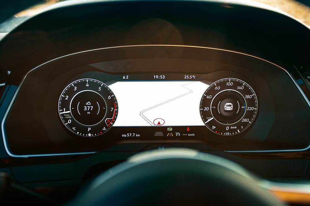 Novostí v tuto chvíli voní dotykový displej s lesklou obrazovkou uprostřed, který nemá rámeček, a tak se tváří jako součást palubky. Ale už ho dostal i Golf a jeho deriváty. Má moc pěknou grafiku, reaguje rychle a neskutečným způsobem se upatlá. Nebo bych si měl víc mýt ruce? R-Line dodává i pěkný sportovní volant s plochou spodní částí věnce. Hezká je obrazovka místo klasických budíků, která má alespoň jiný font než v běžném Passatu. Dobré ale na druhou stranu je, že pokud jste zvyklí na vozy Volkswagenu, budete okamžitě jako doma.