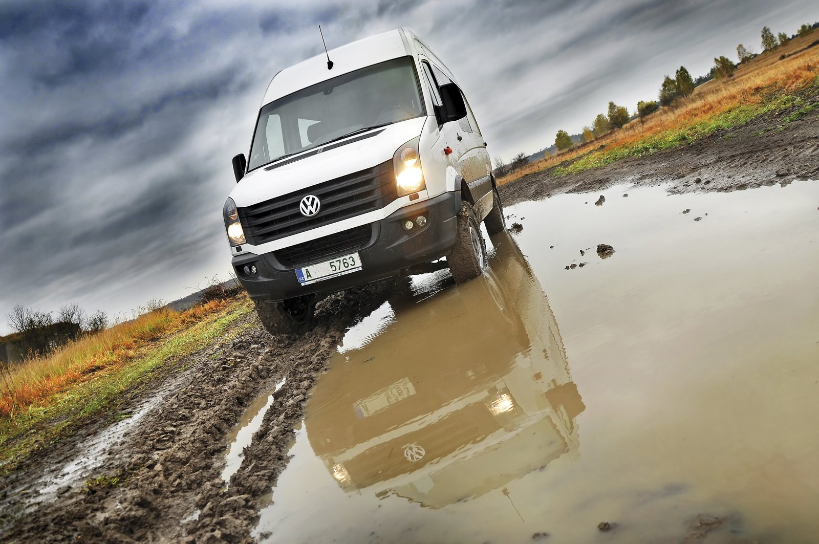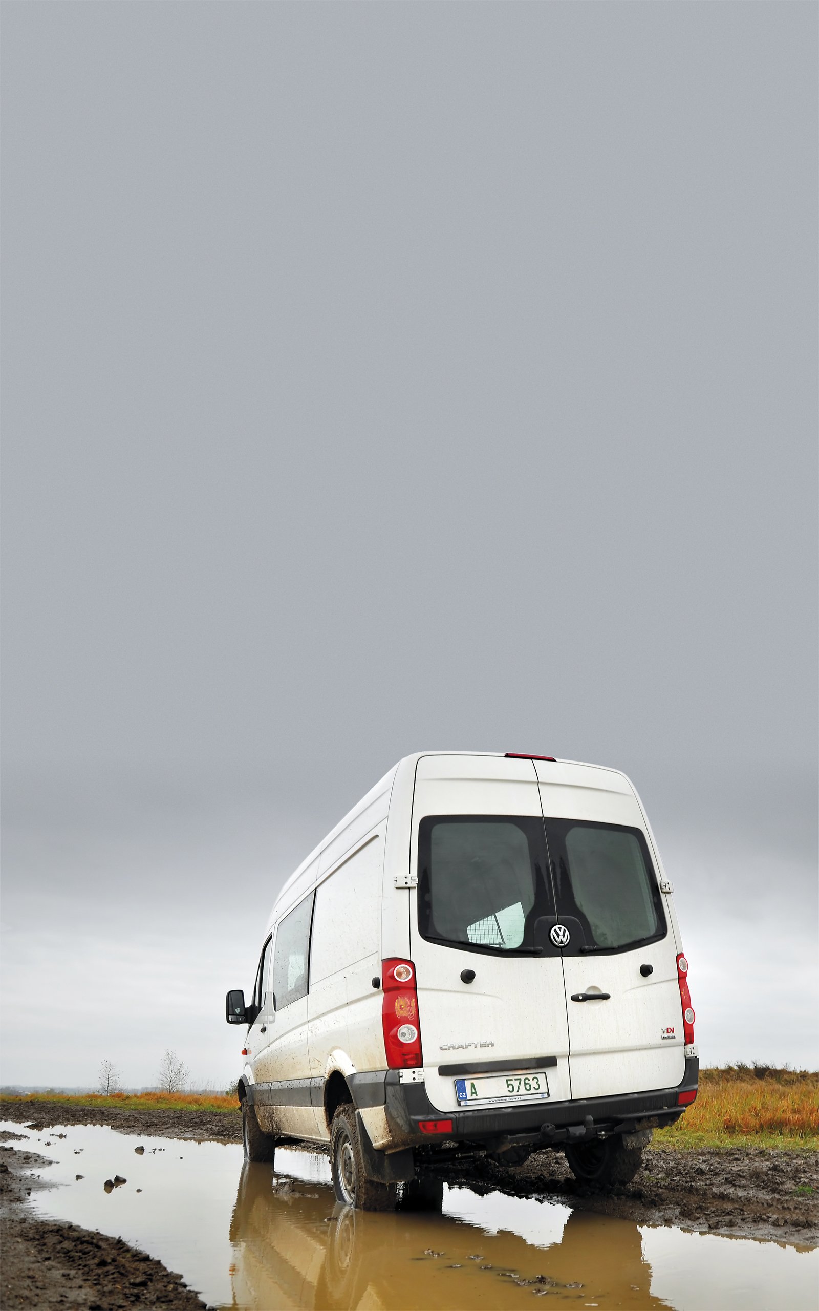 Dodávka je dlouhá, vysoká a těžká. To nejsou právě vhodné vlastnosti pro zdolávání velkých překážek. Jenže společnost Achleitner dokázala takřka zázrak. Zopakujme si výbavu testovaného vozu. Máme uzávěrku všech tří diferenciálů, redukci, pořádnou světlou výšku, s trochou nadsázky obrněný podvozek a terénní pneumatiky. Ačkoli se tváří nenápadně, tohle přece musí fungovat. Počasí nám přálo, celou noc před testem vydatně pršelo a podle toho to také v našem oblíbeném areálu vypadalo. Všude takové bláto, že byste v něm sotva udělali tři kroky. Musím podotknout, že jsem byl velmi vděčný za terénní obutí. Být na vozidle normální pneumatiky, píšu v těchto řádcích o tom, jak jsme Crafter vyprošťovali z první malé kaluže.