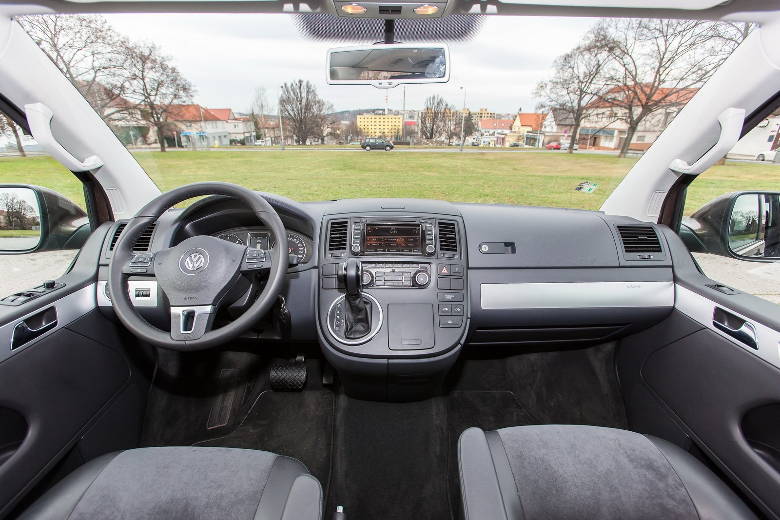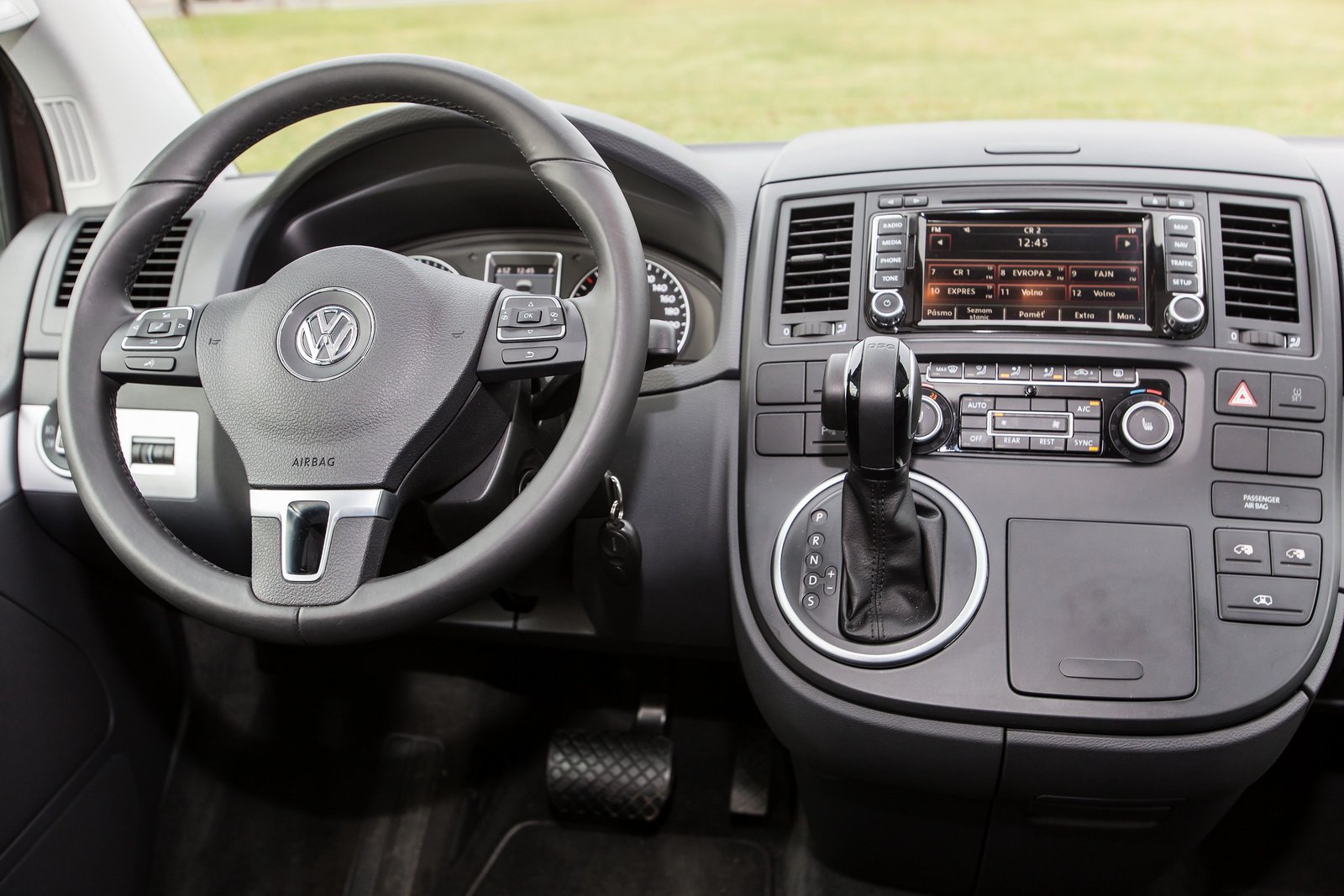 Palubní deska Multivanu je klasickou sbírkou ovládacích prvků koncernu. Není to ale vůbec problém, už je proto, že se v ní snadno a okamžitě zorientujete. Známé budíky, páčky pod volantem, ovladače klimatizace nebo multimediální systém s navigací doplňuje ale velké množství odkládacích prostor včetně výsuvného držáku na mince do parkovacích automatů nebo dalšího boxu pro velkou láhev. Zajímavé je, že zde najdeme stále klasickou páku ruční brzy a ne elektrickou.