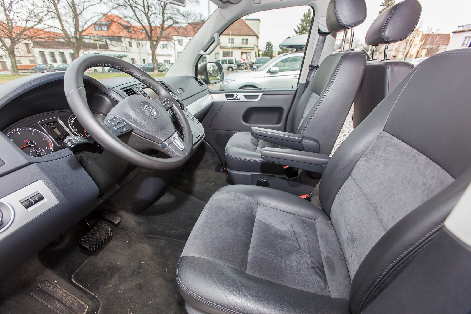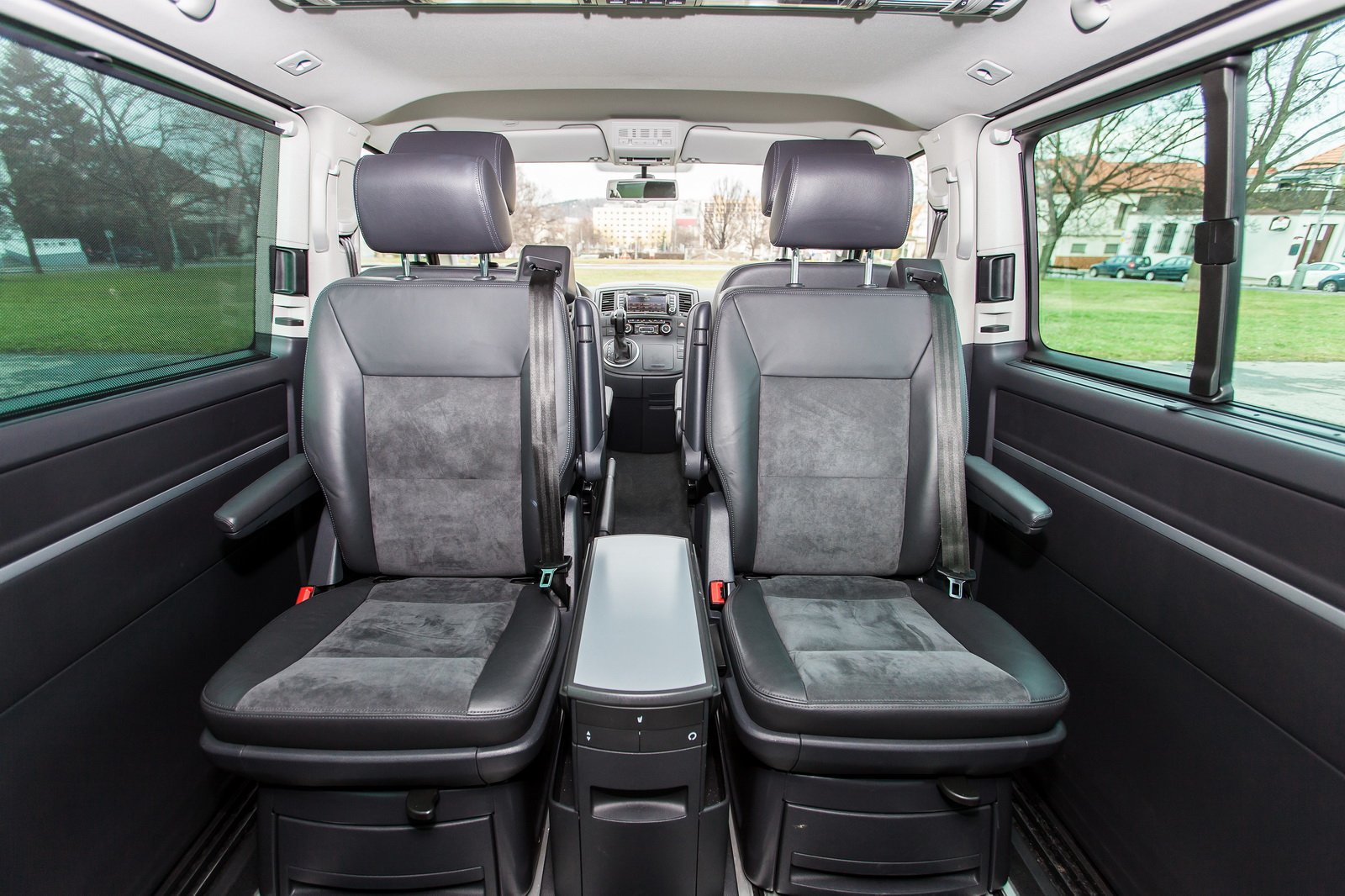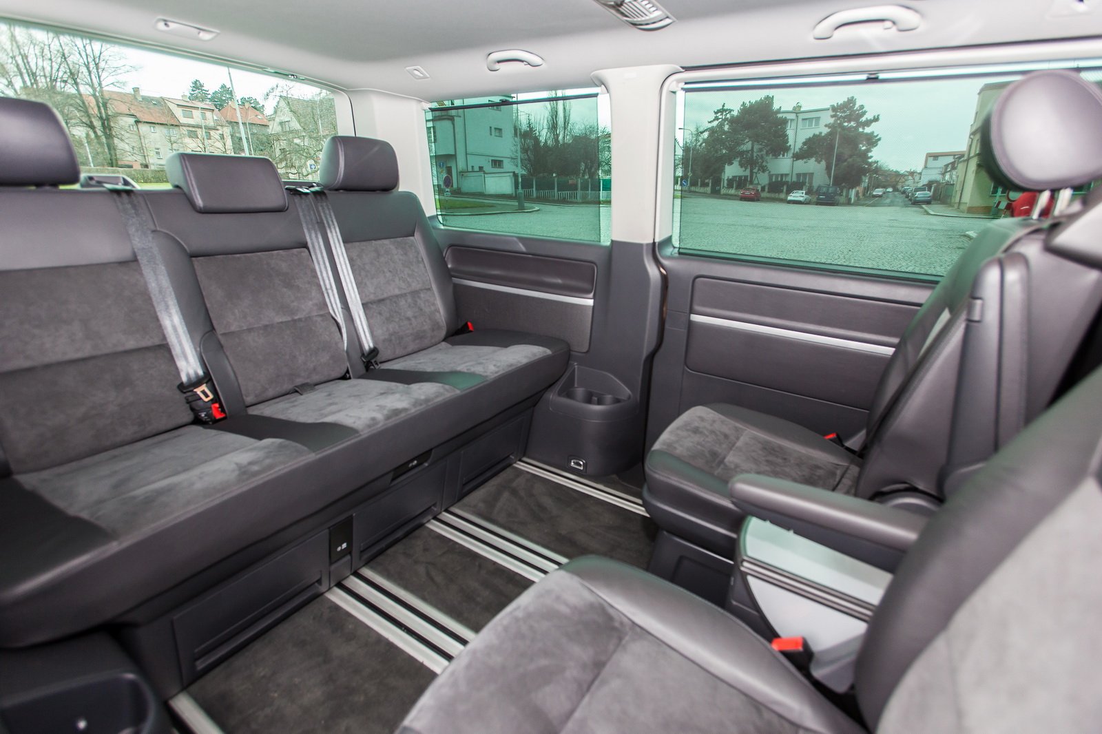 Testovaný vůz byl určen pro převážení sedmi lidí, tedy se dvěma samostatnými sedadly s vlastními loketními opěrkami v první a druhé řadě a trojmístnou lavicí v řadě třetí. Sedadla ve druhé řadě jsou sklopná, otočná a vyjímatelná. Multivan tak nabízí opravdu variabilní interiér, kdy se vše včetně výklopného stolku uprostřed posouvá po kolejnicích, což usnadňuje manipulaci.