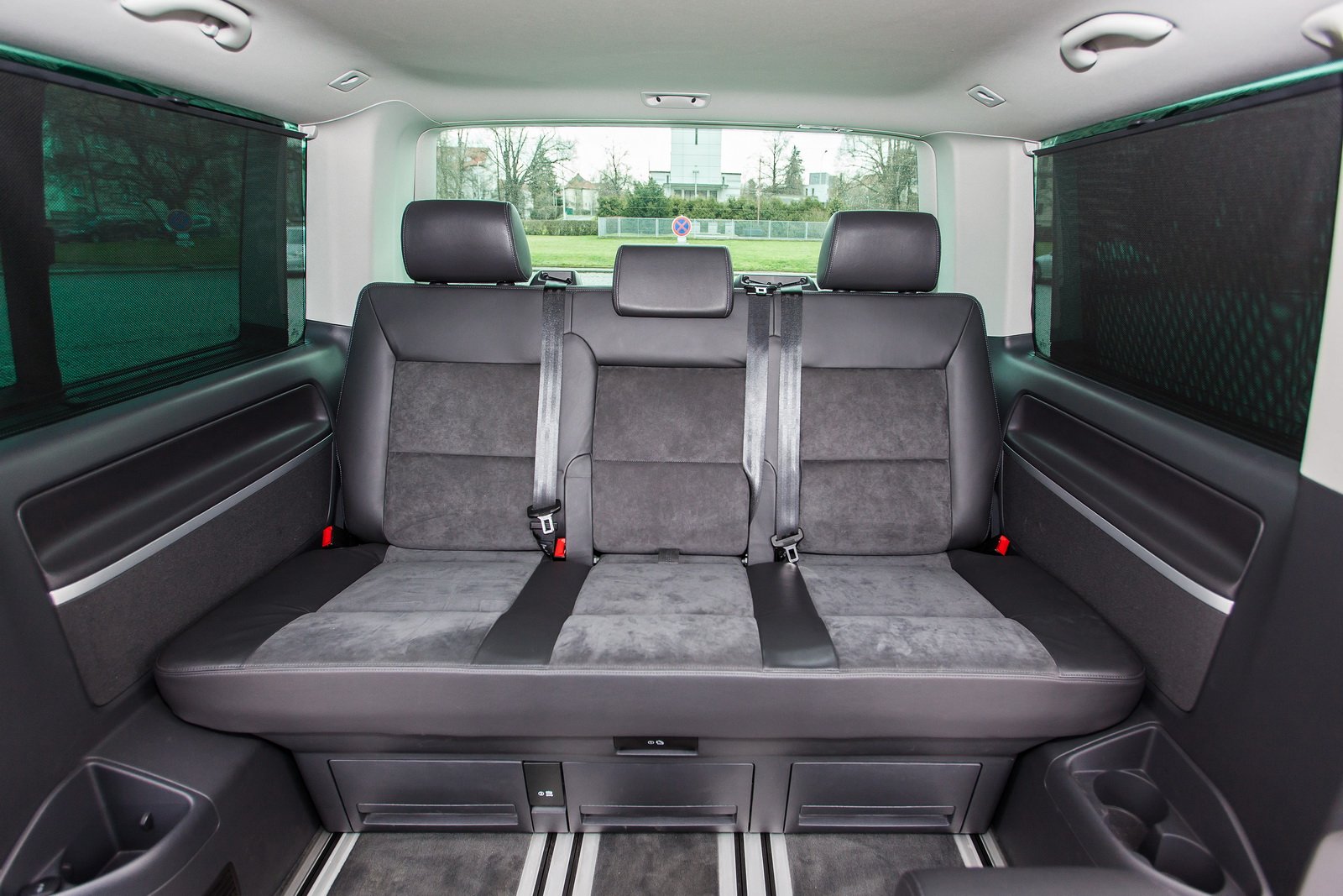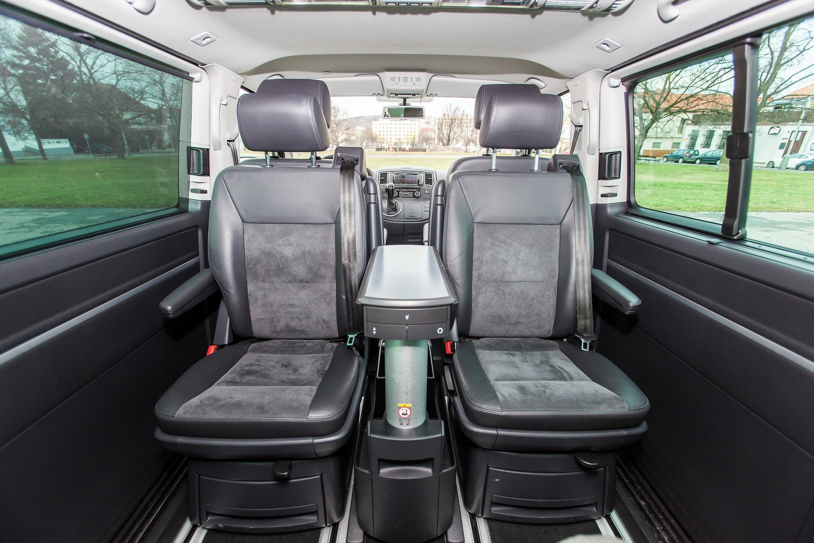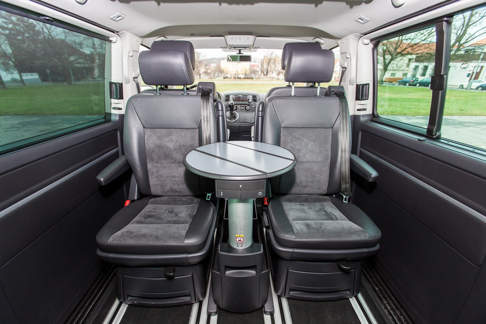 Testovaný vůz byl určen pro převážení sedmi lidí, tedy se dvěma samostatnými sedadly s vlastními loketními opěrkami v první a druhé řadě a trojmístnou lavicí v řadě třetí. Sedadla ve druhé řadě jsou sklopná, otočná a vyjímatelná. Multivan tak nabízí opravdu variabilní interiér, kdy se vše včetně výklopného stolku uprostřed posouvá po kolejnicích, což usnadňuje manipulaci.
