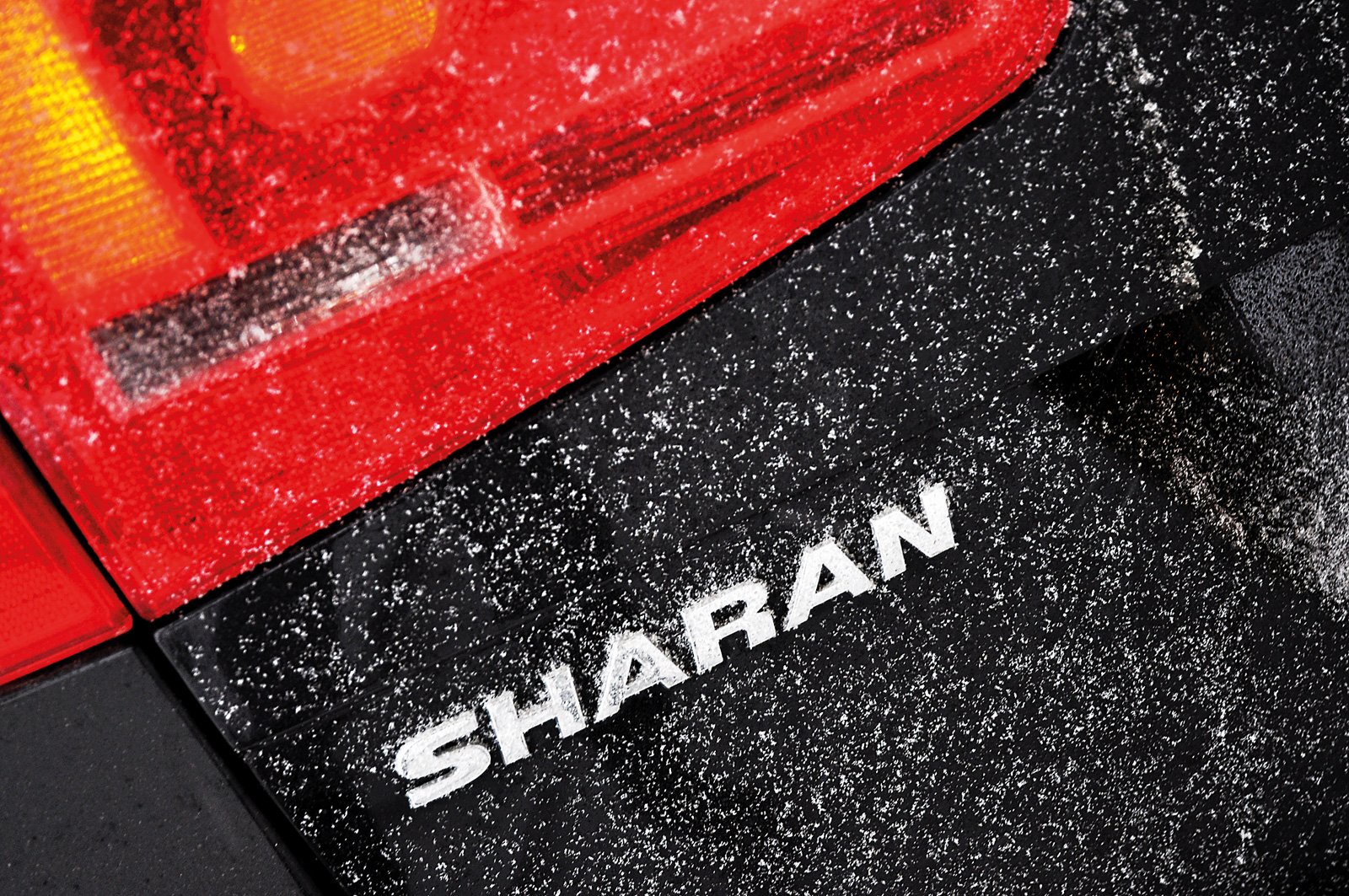 Sharan k tomu přidává ještě specialitku v podobě posuvných zadních dveří, jejichž pojezdová lišta není nijak výrazně maskovaná, ale siluetu auta neruší. Vnější zpětná zrcátka naštěstí velikostí spadají mezi běžné osobní vozy a nepřipomínají sloní uši. Silueta, která na fotografiích působí kvůli masivní kapotě trochu dvouprostorově, je v reálu mnohem uhlazenější, a Sharan tak skutečně vzhledově navazuje na první generaci. Jak již bylo několikrát řečeno, největším problémem je záď, která je od menšího Touranu prakticky neodlišitelná.