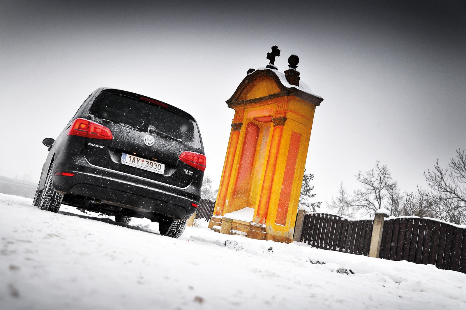 S momentálně panujícími tuhými mrazy se Sharan umí vypořádat velmi dobře. Kromě vyhřívání zadního skla nabízí možnost rychle odmrazit i sklo přední – vedou jím totiž svislé odporové drátky, kterých si všimnete jen při soustředěném pohledu. Využili jsme je hned několikrát. Stěrače už nejsou motýlkové jako v první generaci, nýbrž klasické.