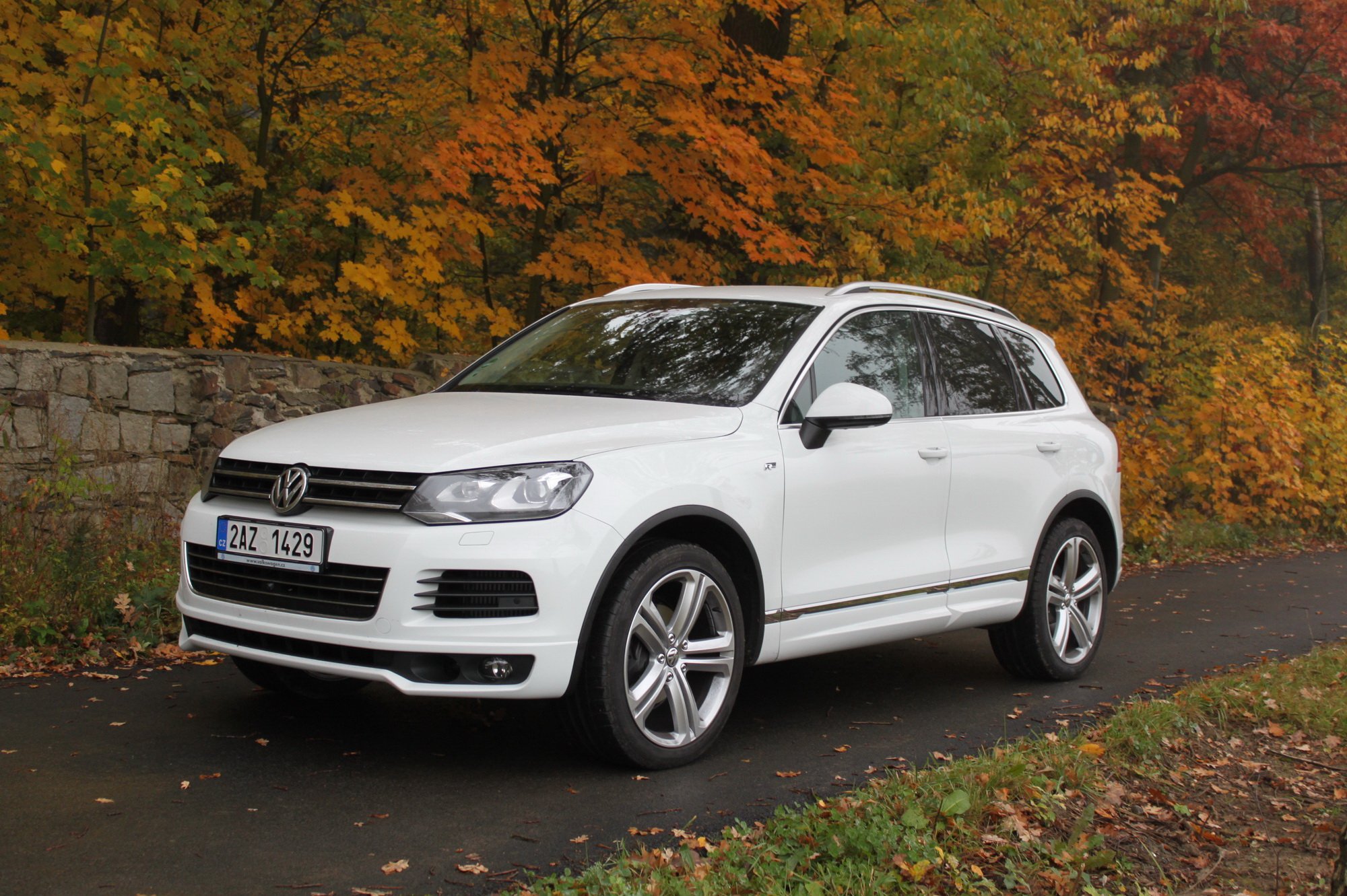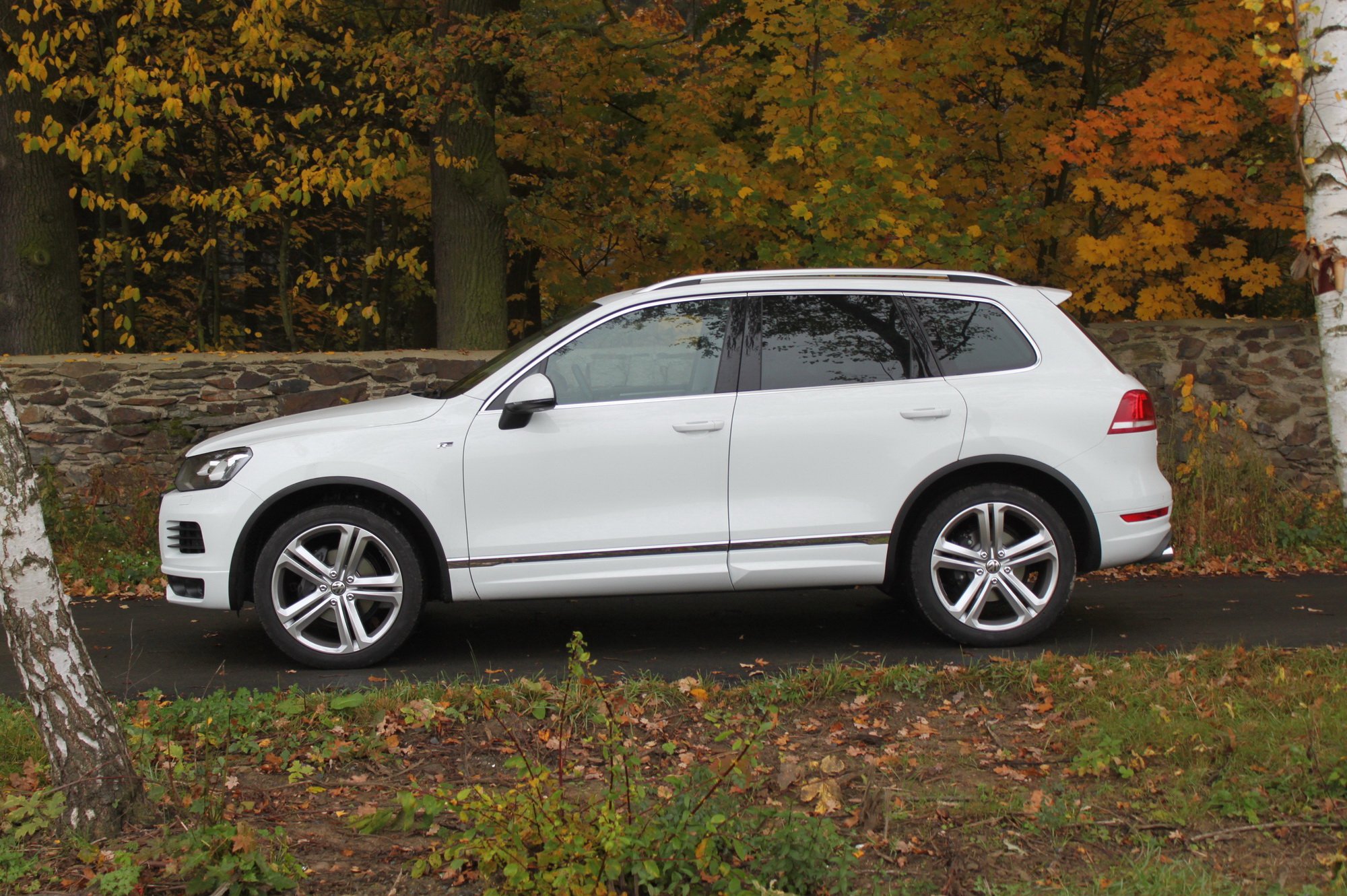 Volkswagen Touareg v bílém laku a navíc ve sportovně střiženém provedení R-line vypadá na první pohled poněkud rozporuplně. Na rozdíl od běžných výbav totiž na sebe upoutává pozornost a naznačuje, že by za jeho volantem mohla sedět stejná sorta řidičů, jako třeba v patřičně upravené Audi Q7. Vynechám komentář, ale vám je určitě jasné, kdo na svém SUV potřebuje 21“ litá kola, sportovní spoilery a nárazník.