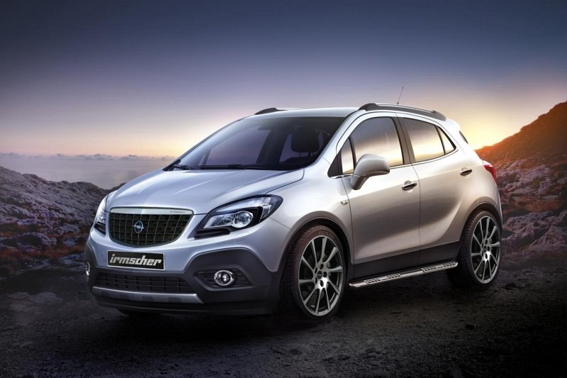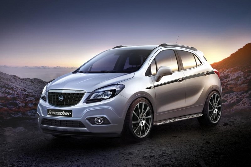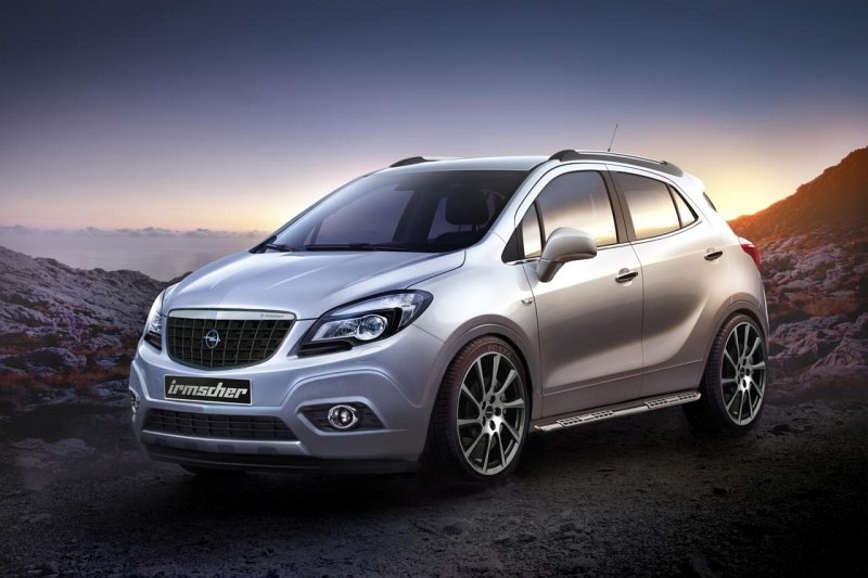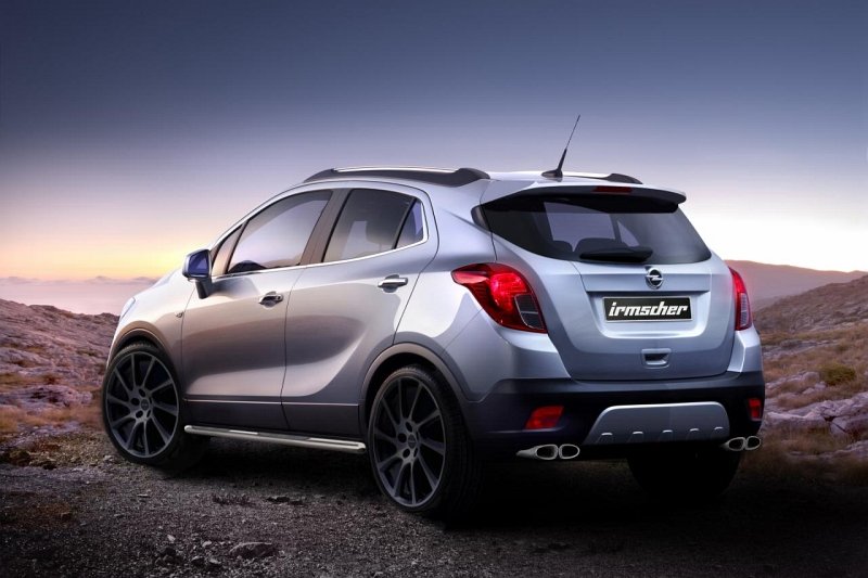 Irmscher nabízí hned několik variant aerokitu pro malý crossover Opel Mokka. Základem je vždy maska s nerezovou mřížkou se vzorem včelí plástve, shora je lemovaná hladkou lištou. Logo Opelu je nyní vsazené do středu masky. Přední nárazník je také nově tvarovaný. Ochranné oplastování je možné nalakovat v barvě vozu, bok auta může zvýraznit šípovitá linka v úrovni klik dveří. Páté dveře nesou střešní spoiler (není na fotografiích), zatímco koncovky výfuku tu jsou hned čtyři. V kabině se zásahy omezily na volant a sedadla potažené vybranou kůží plus koberečky s logem Irmscher.
